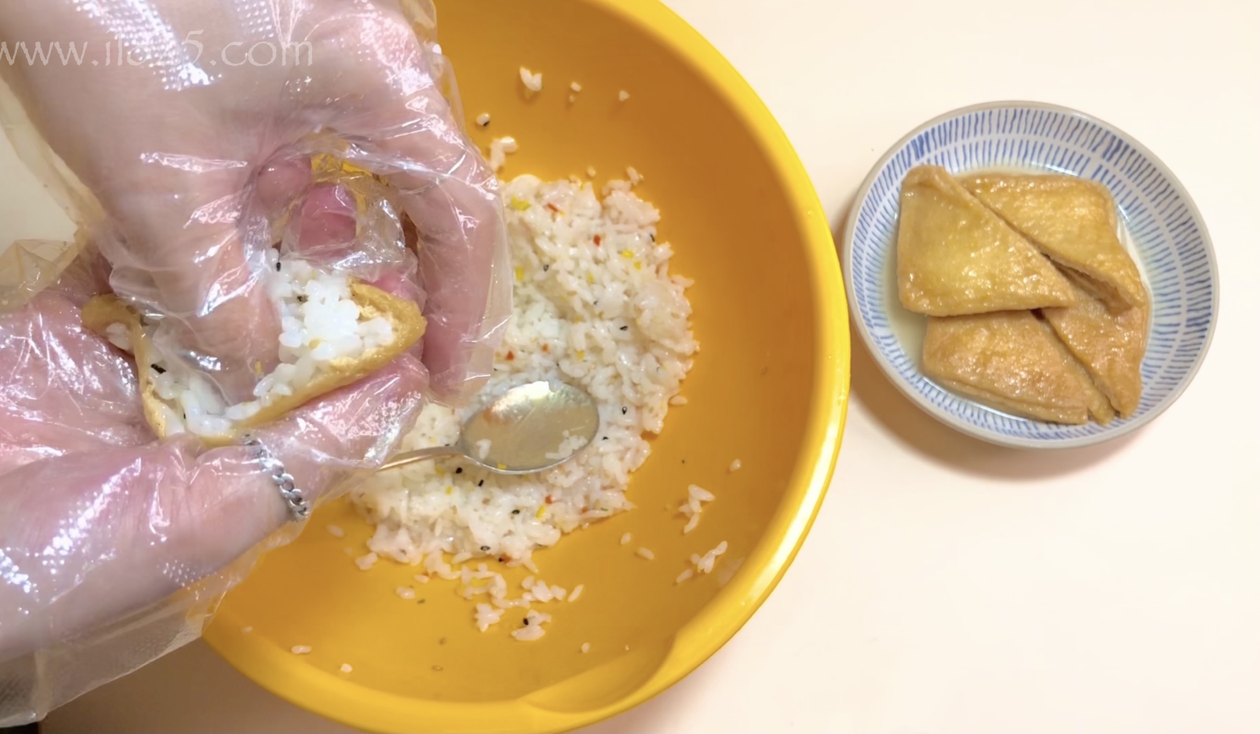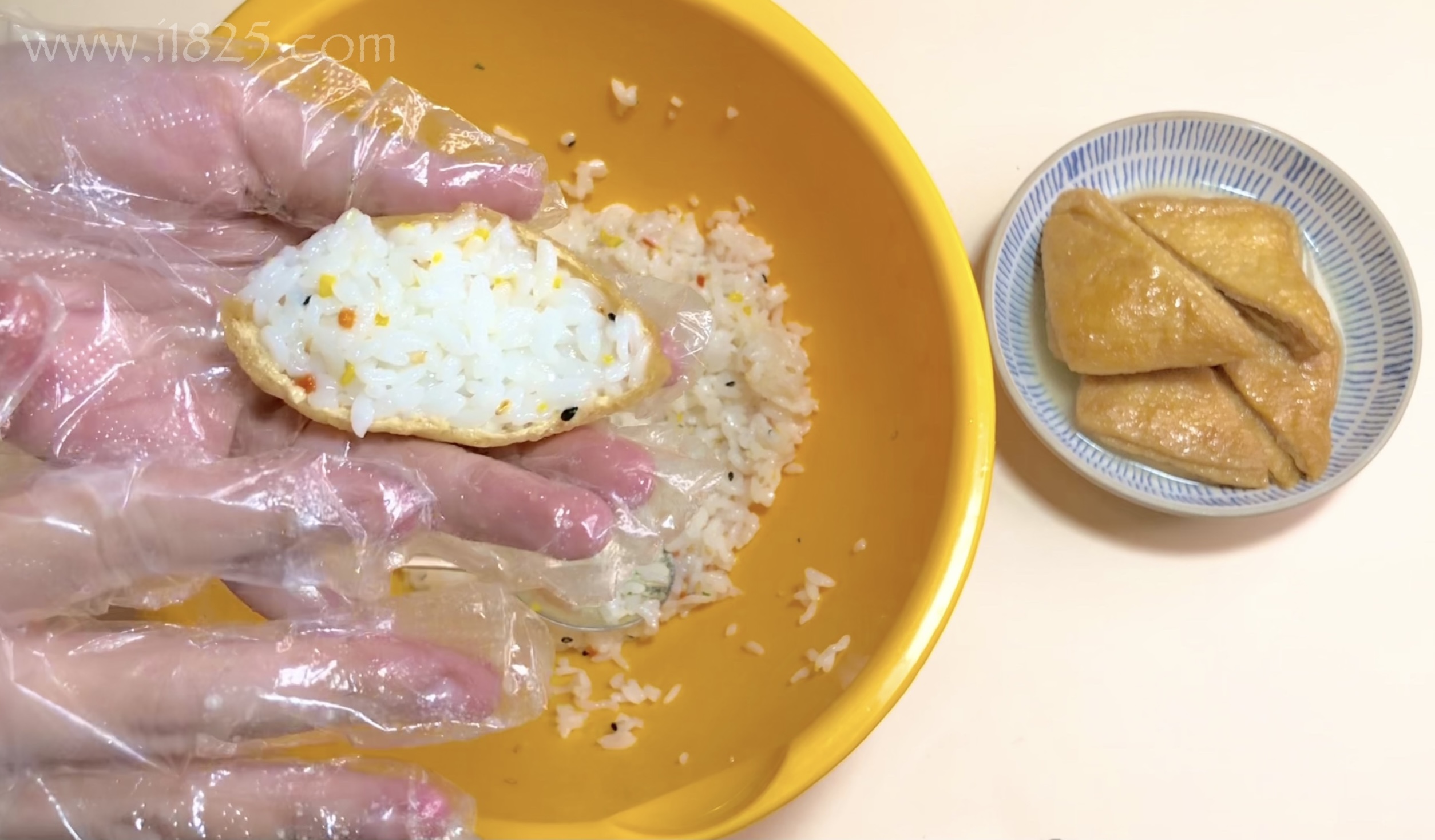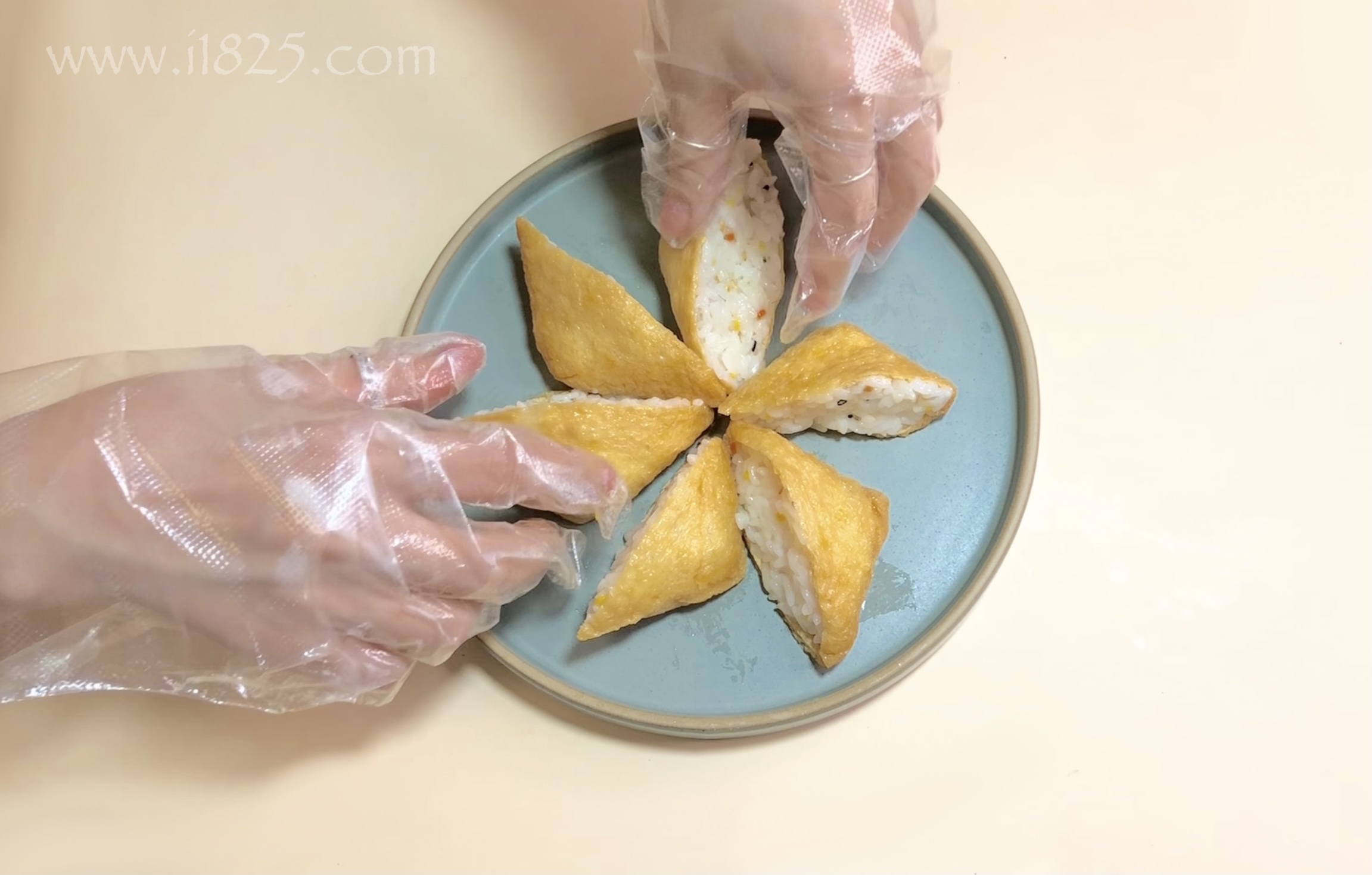 욕심부려서 너무 밥을 많이 넣으면 유부가 외관상 예쁘지 않거나 찢어질 수 있어요.