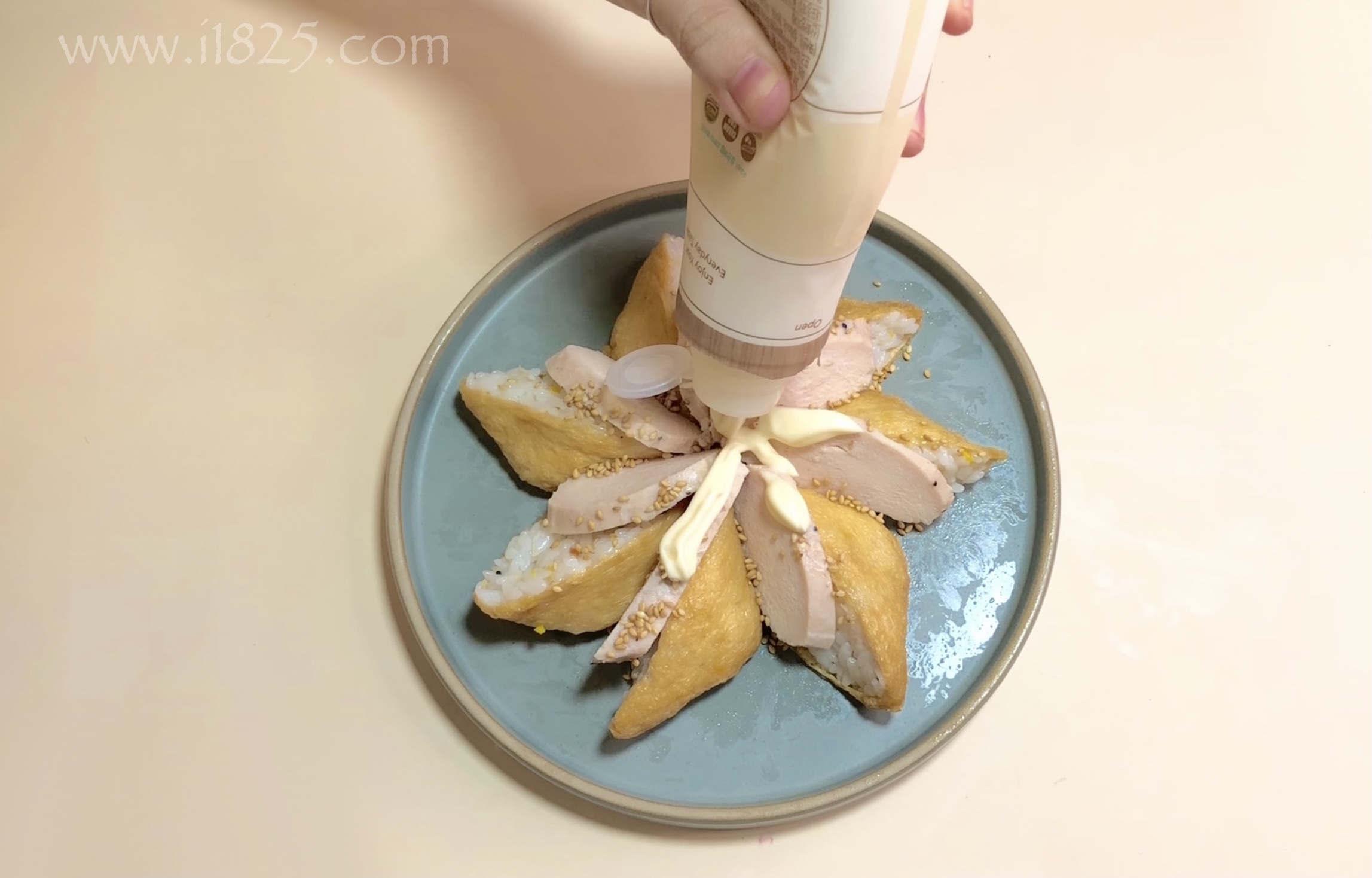 페퍼론치노홀 3개를 데코의 마무리로 마요네즈 중앙에 톡톡톡 올리면 이제 완전히 초간단 유부초밥 만들기가 완성되었습니다!