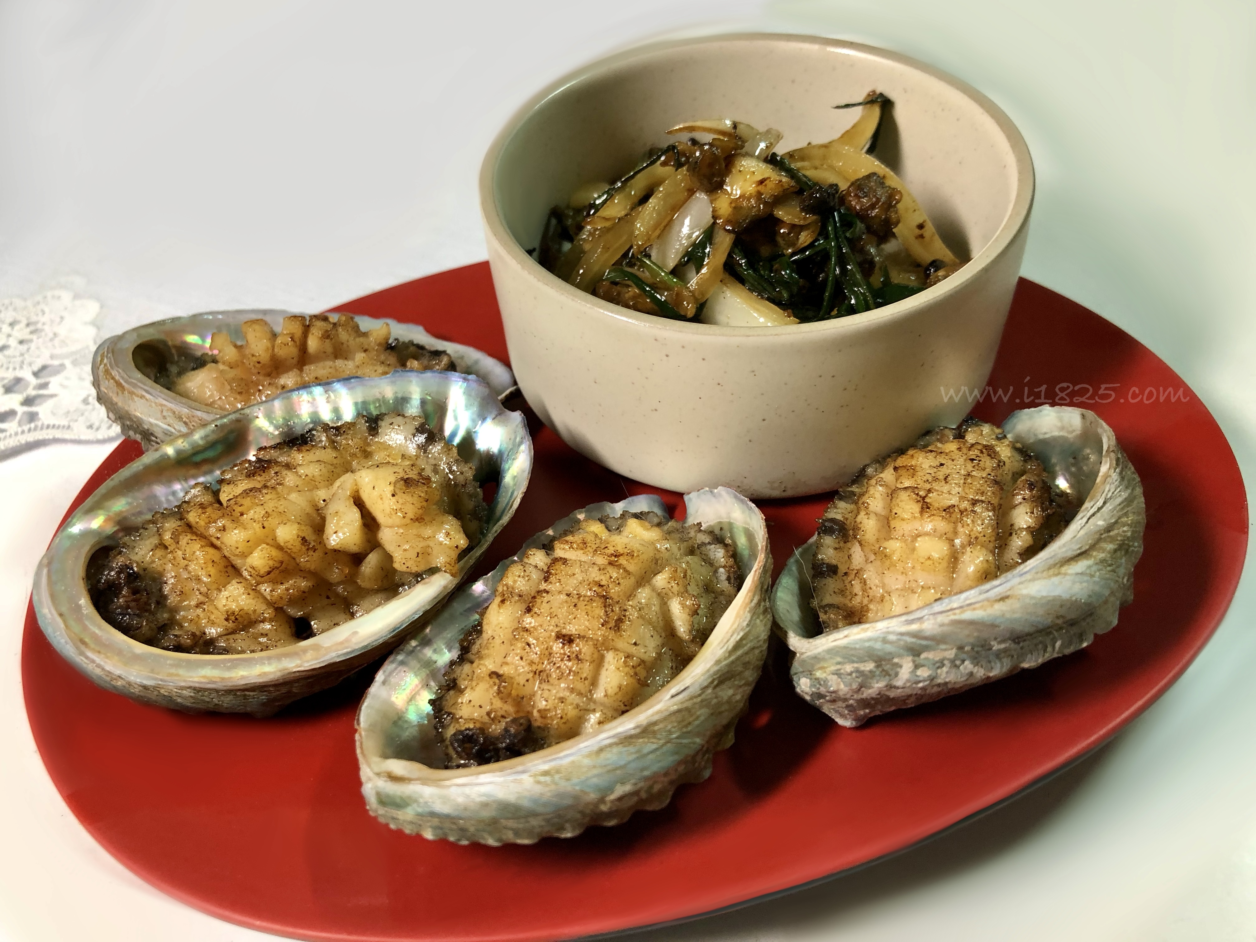 자, 이렇게 완성된 전복 버터구이와 전복내장을 사용한 전복내장 볶음을 접시에 담아내 주었어요.