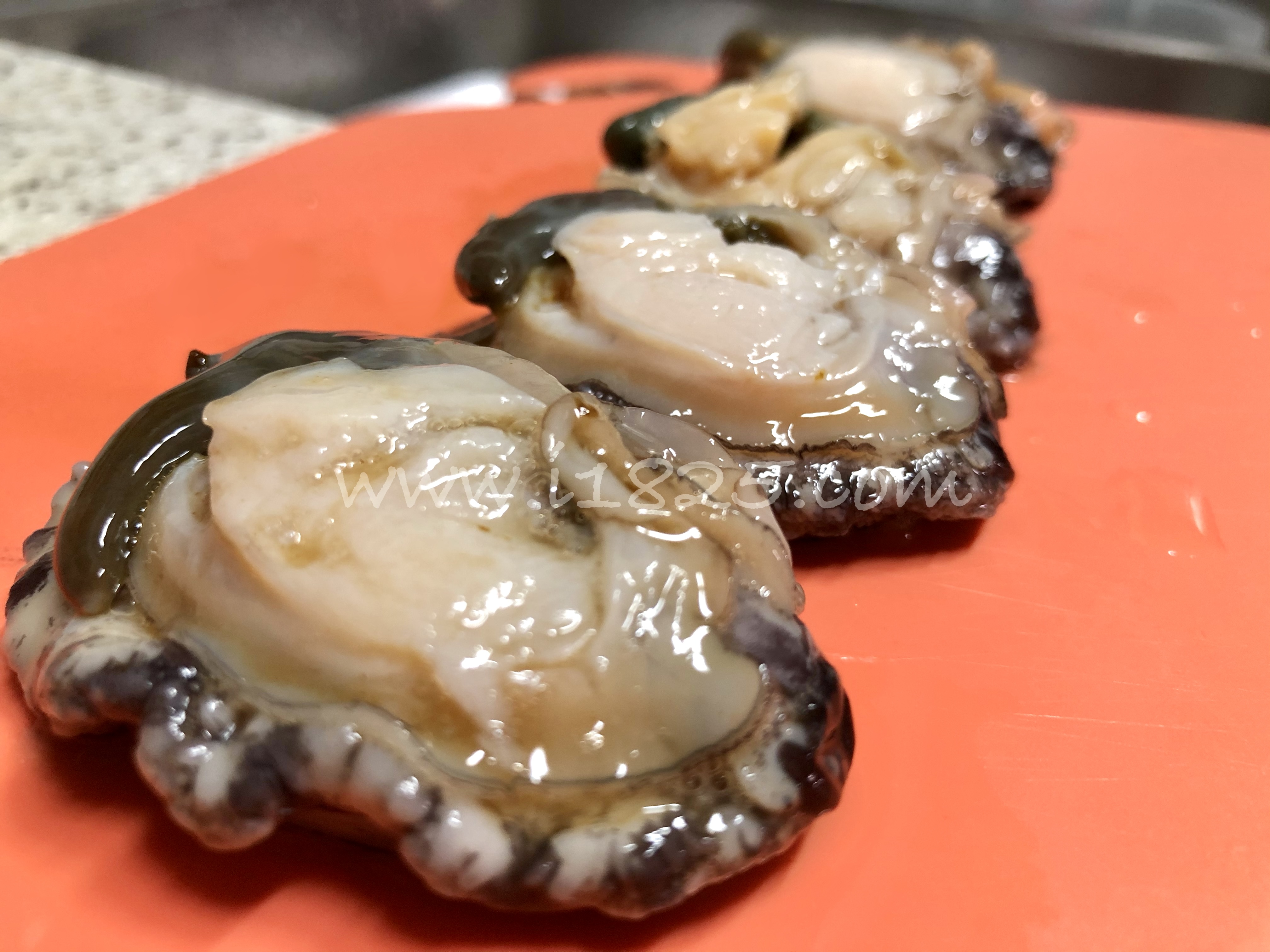 세척 후 최종 손질까지 마친 전복을 뒤집어서, 그러니까 전복 껍데기에서 분리하기 전 원래 전복을 보면 전복 껍질에 붙어있는 면을 격자무늬로 칼집을 내주세요.