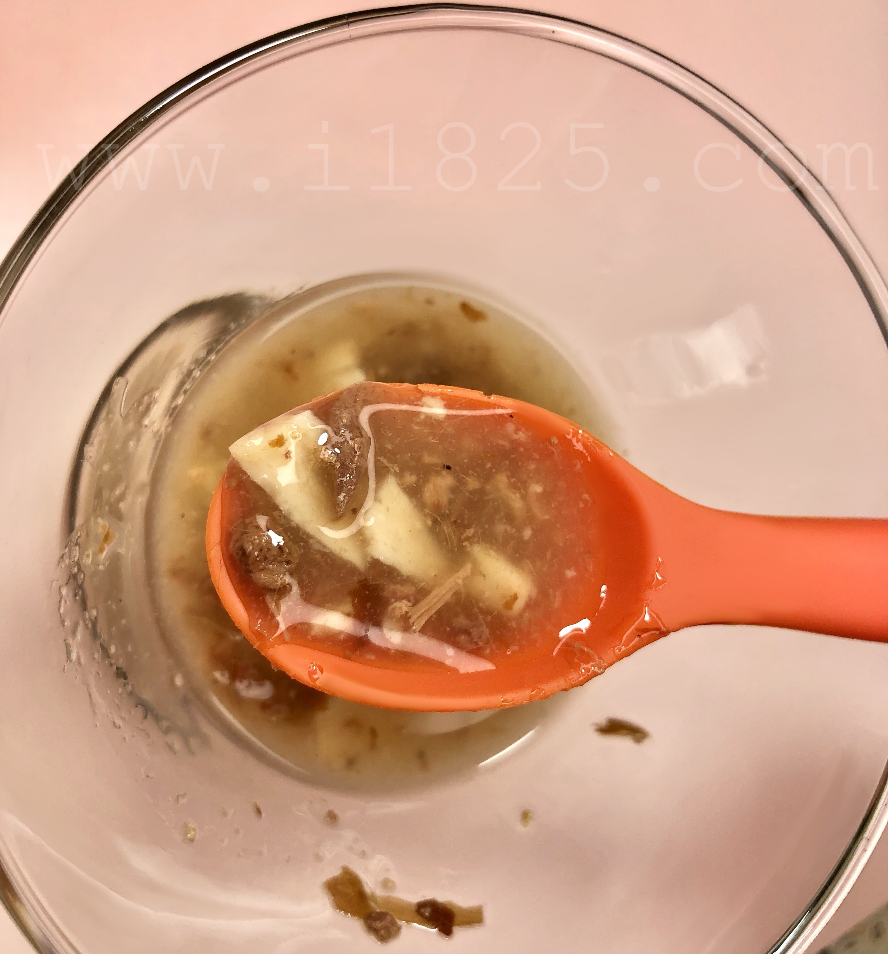 좀 더 투명한 느낌이지만 투명해서 그냥 물에 사료를 타서 깔끔한 느낌이 아니라 둘이 오래 섞여있던 농도 짙은 질척이는 질감이 보여요.