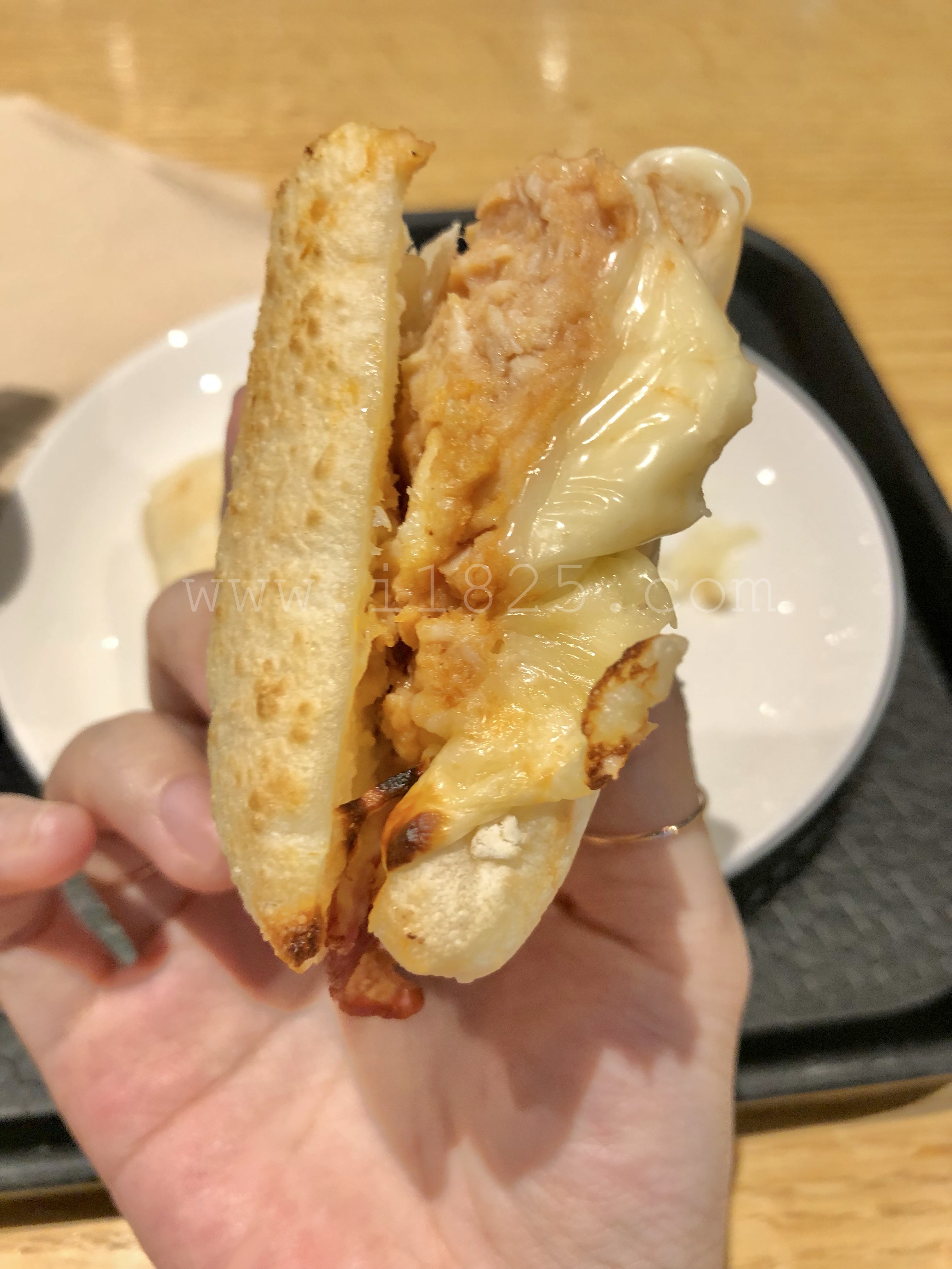 빵, 바비큐 소스 치킨 패티, 베이컨 1줄, 치즈 1 장, 양파 아주 조금
