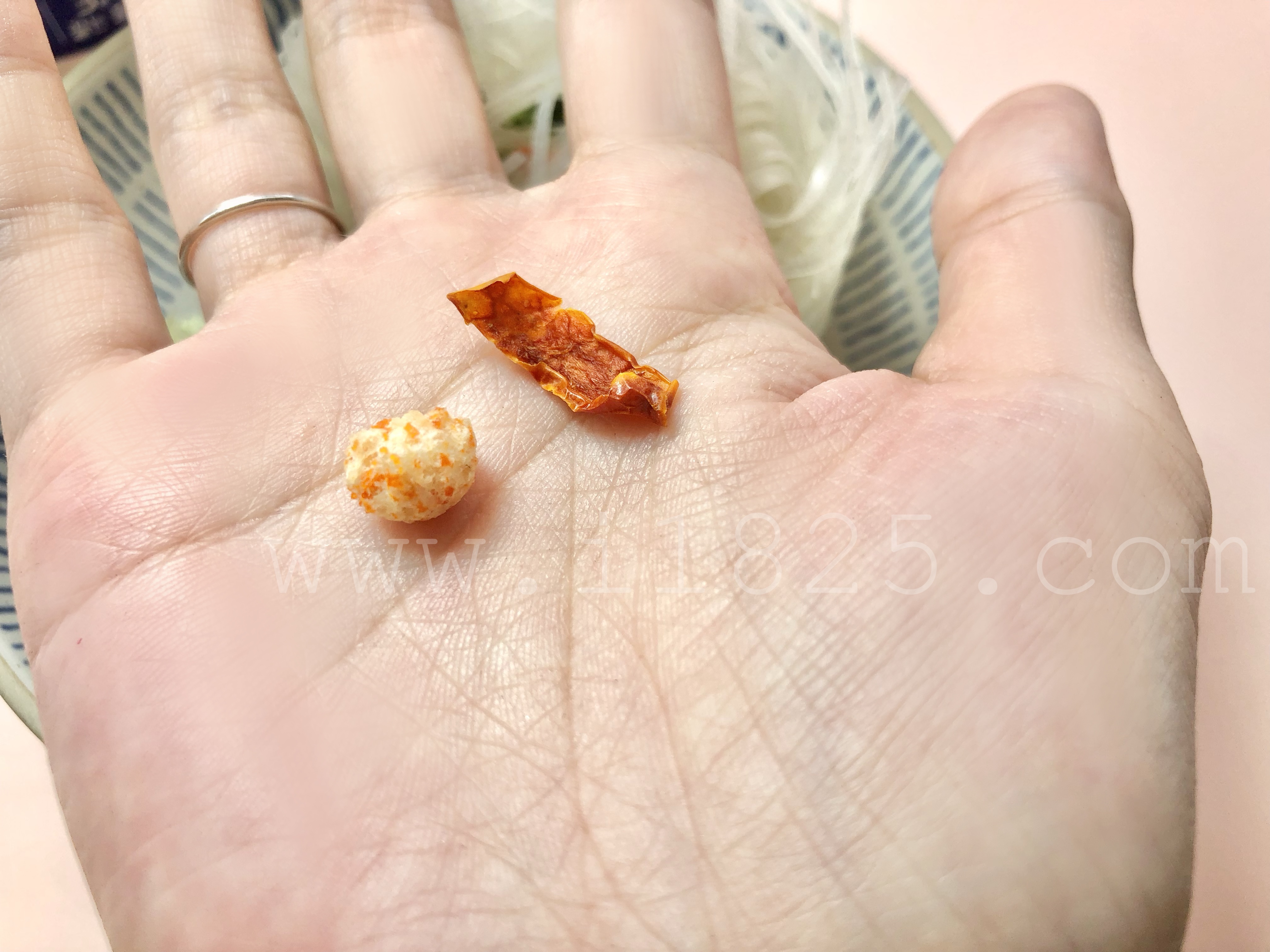 컵누들 쌀국수 똠양꿍 속 건조된 새우살과 말린 고추의 모습입니다.