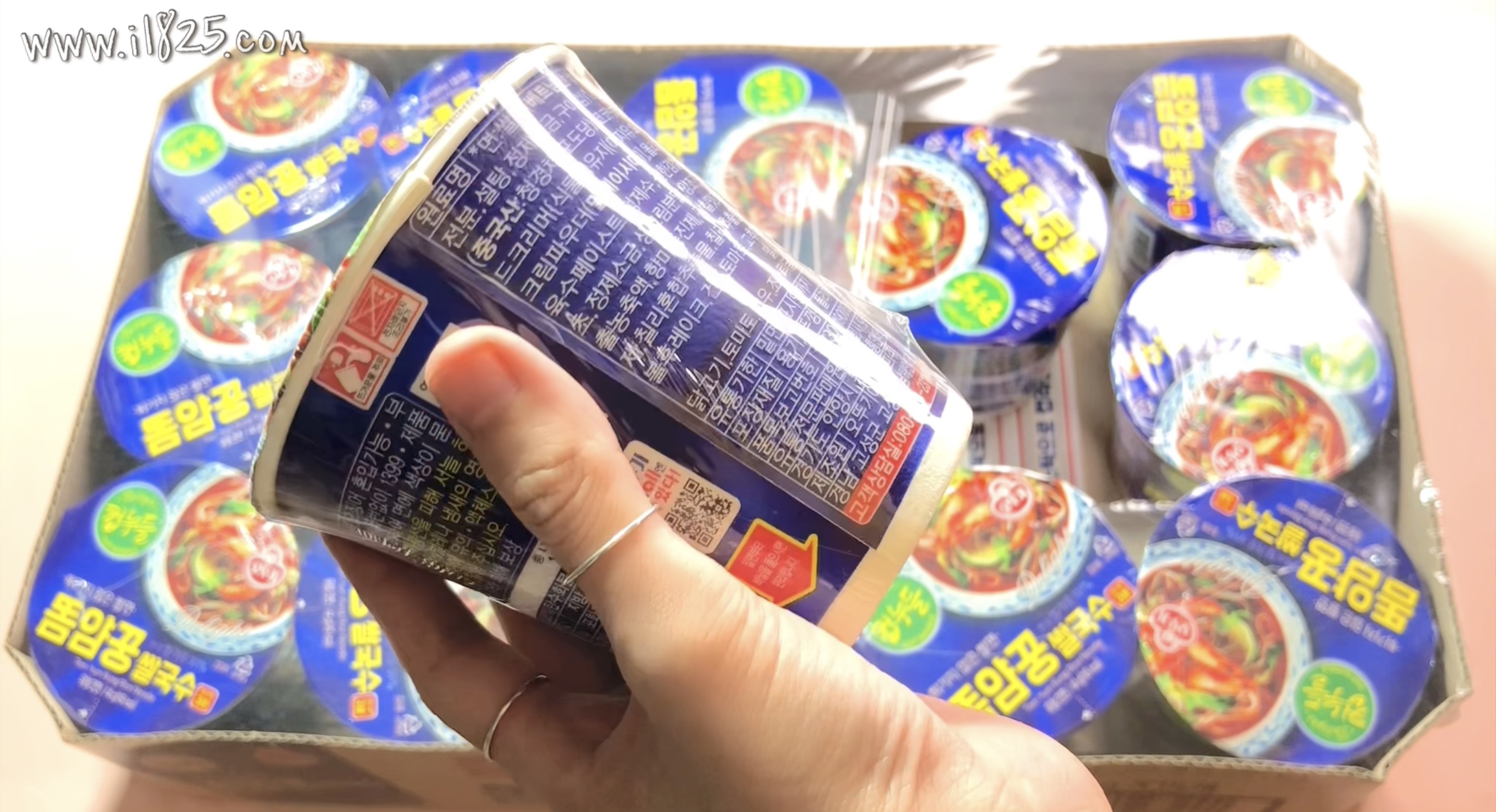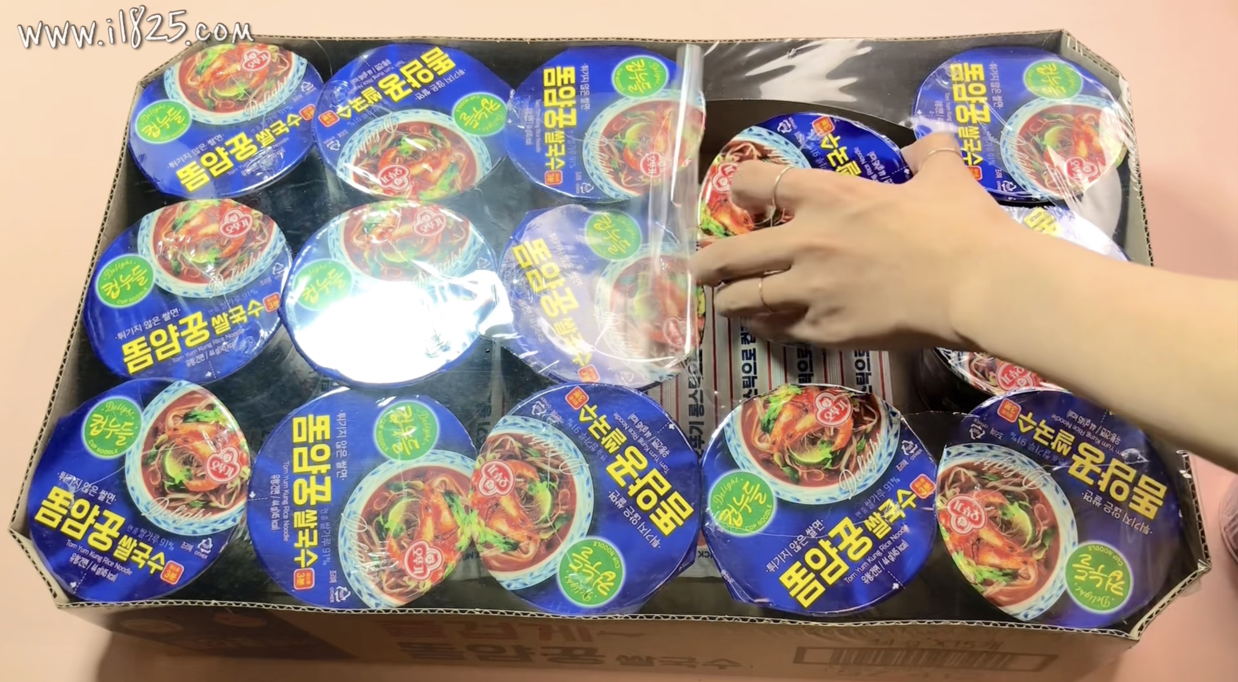 겉으로 한 박스를 포장하고 있는 비닐 하나, 꺼내보면 컵누들마다 각각 포장된 비닐 둘 이렇게 이중포장이 되어있어요.