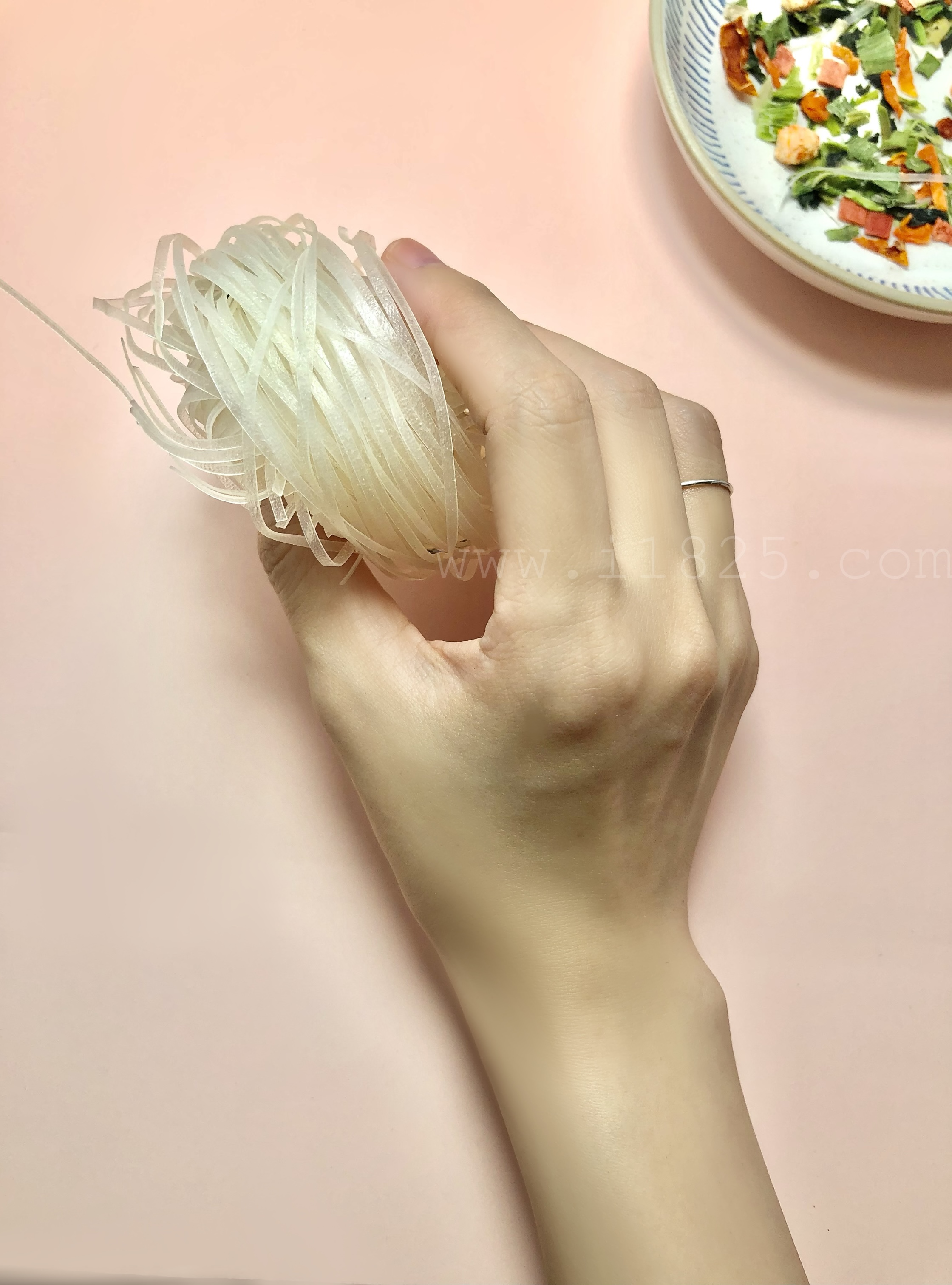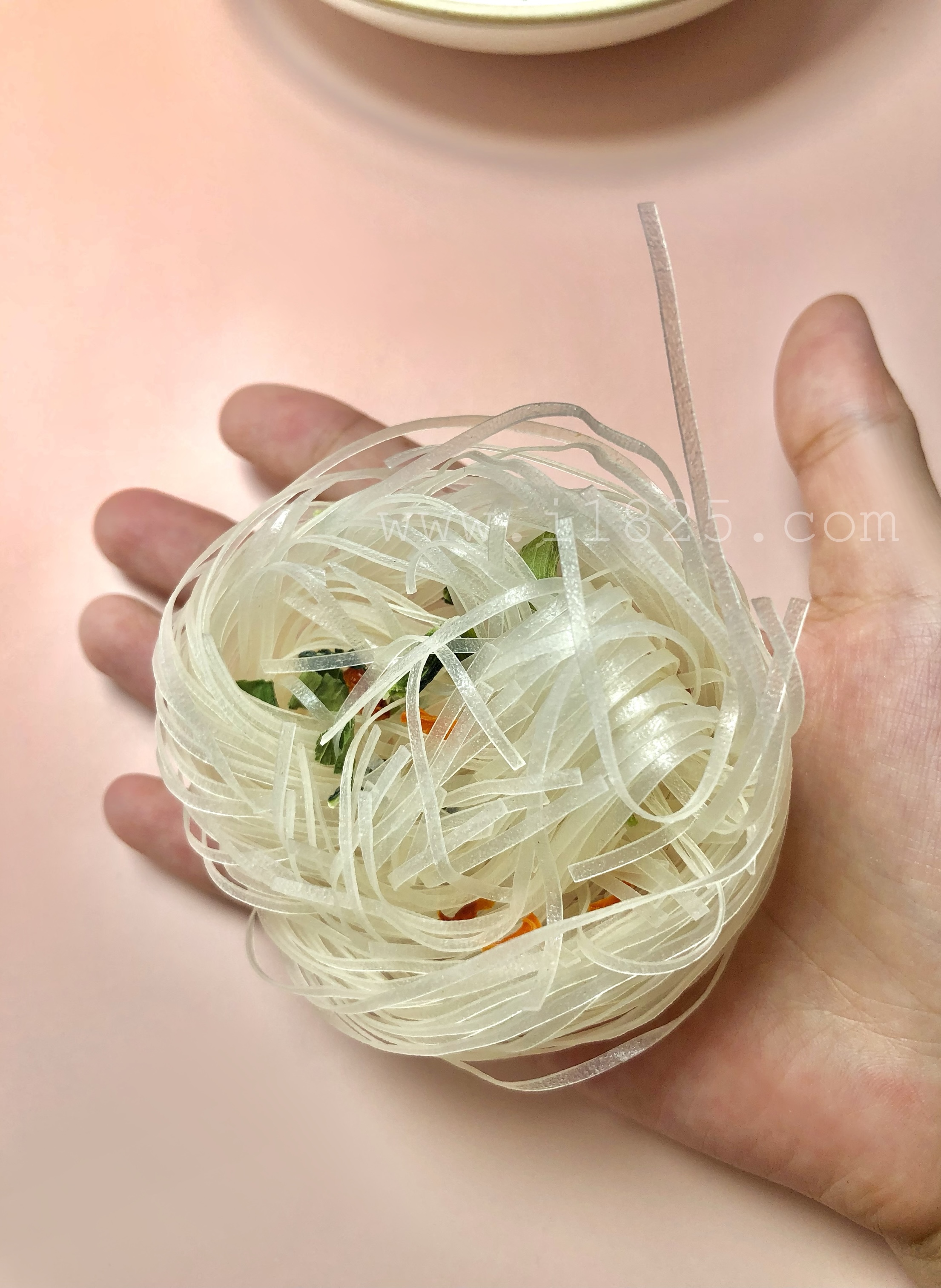 일반적인 튀겨 만든 노란색 면발이 아닌 투명한 백색의 납작 네모난 당면의 얇은 버전 같이 생겼어요.