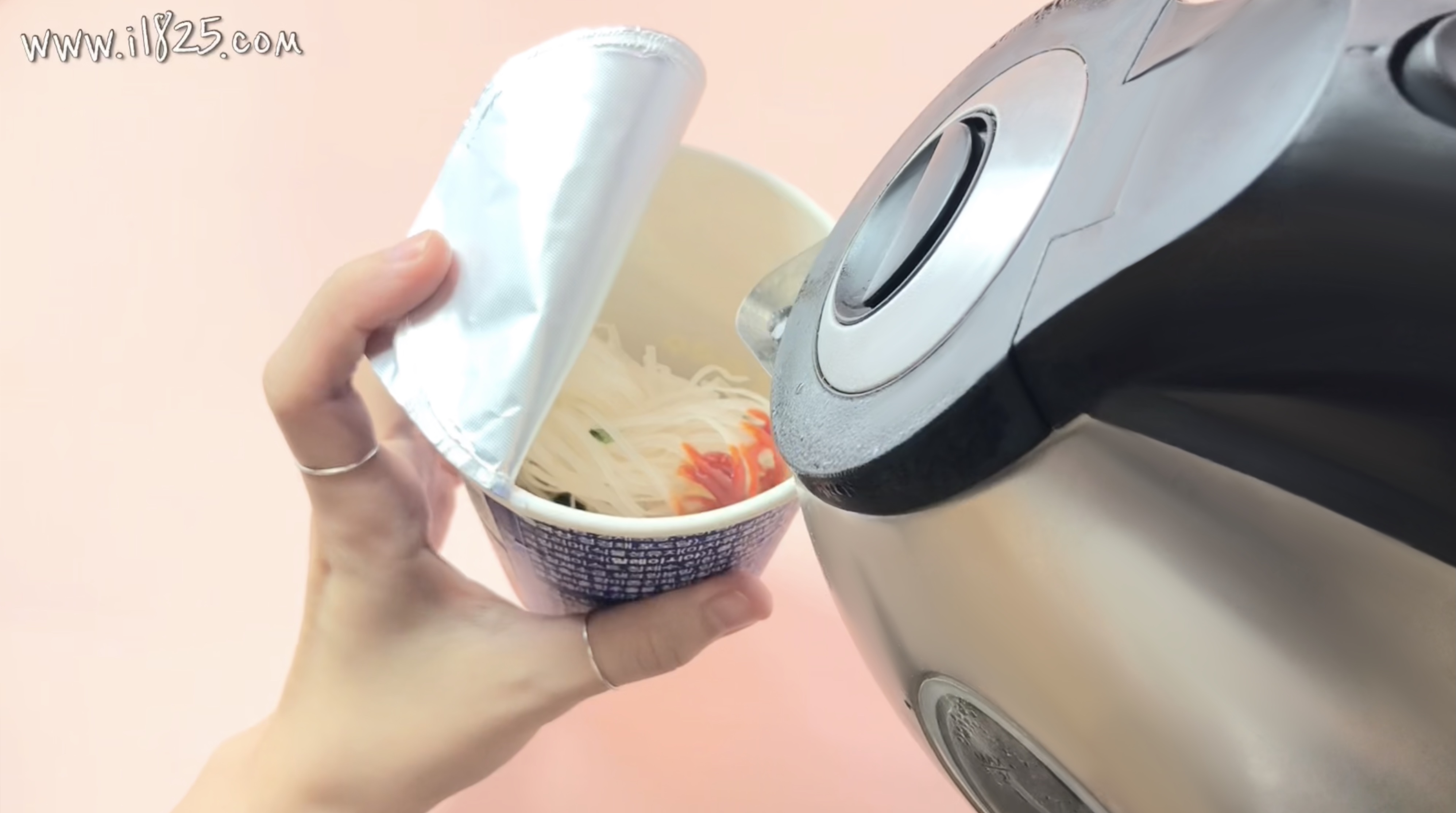 6. 액체스프를 넣어놓은 컵누들 똠양꿍에 뜨거운 물을 붓고 3분을 기다려주세요.