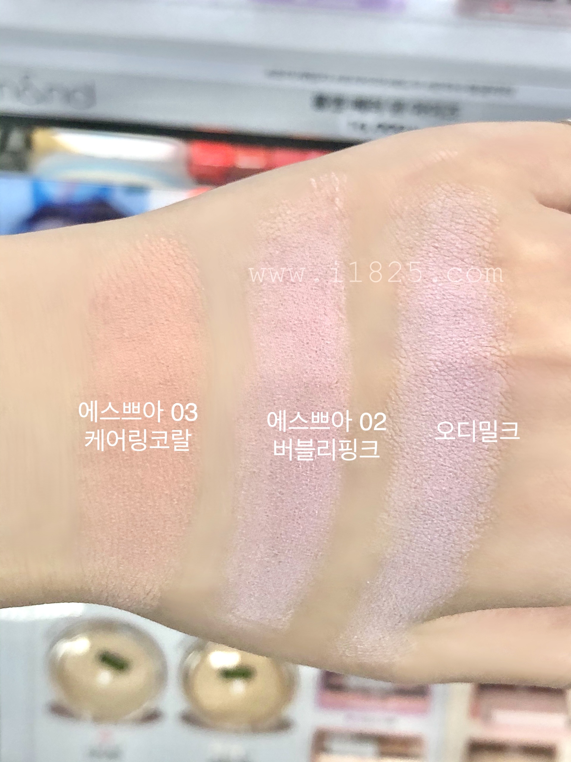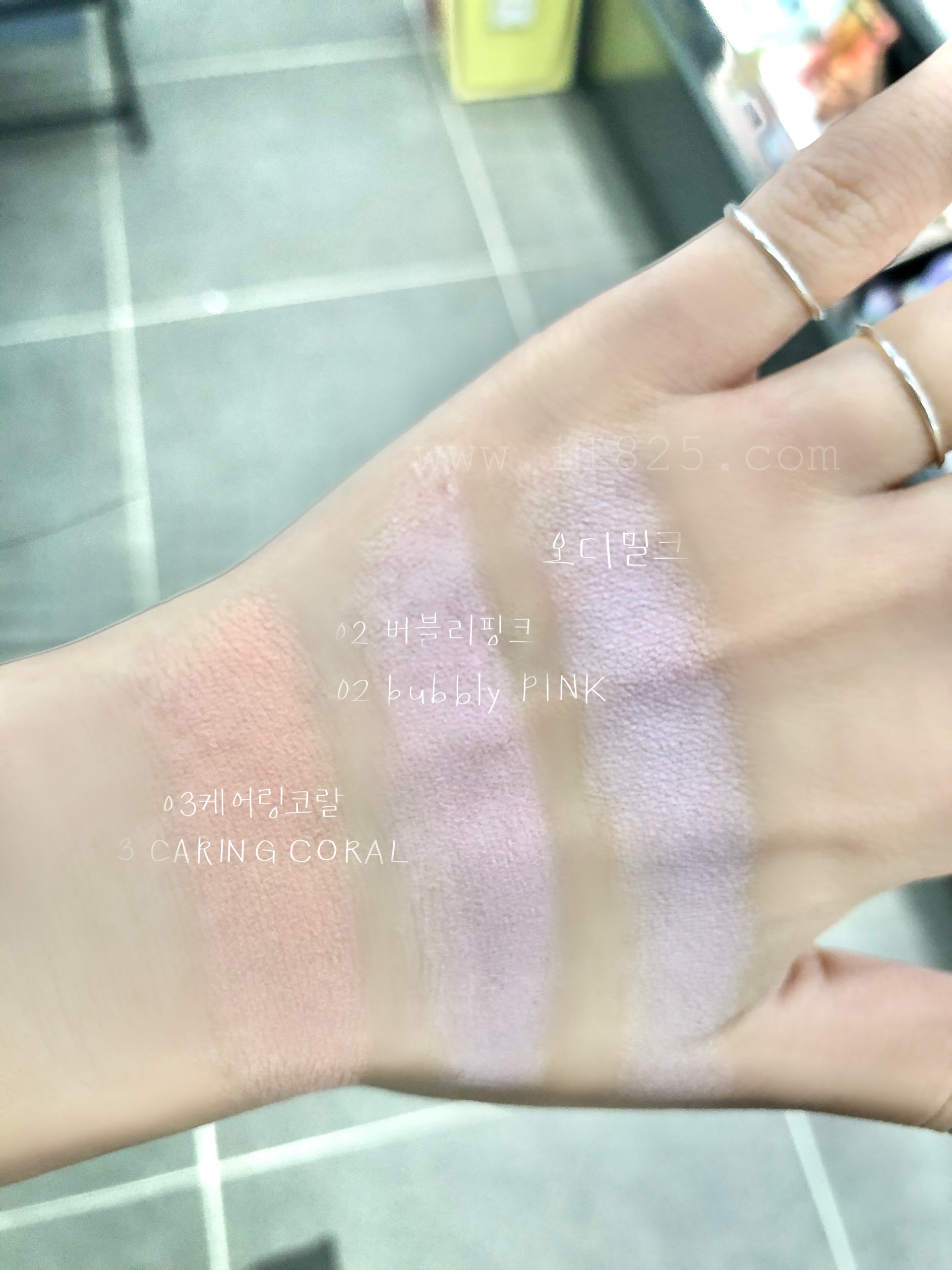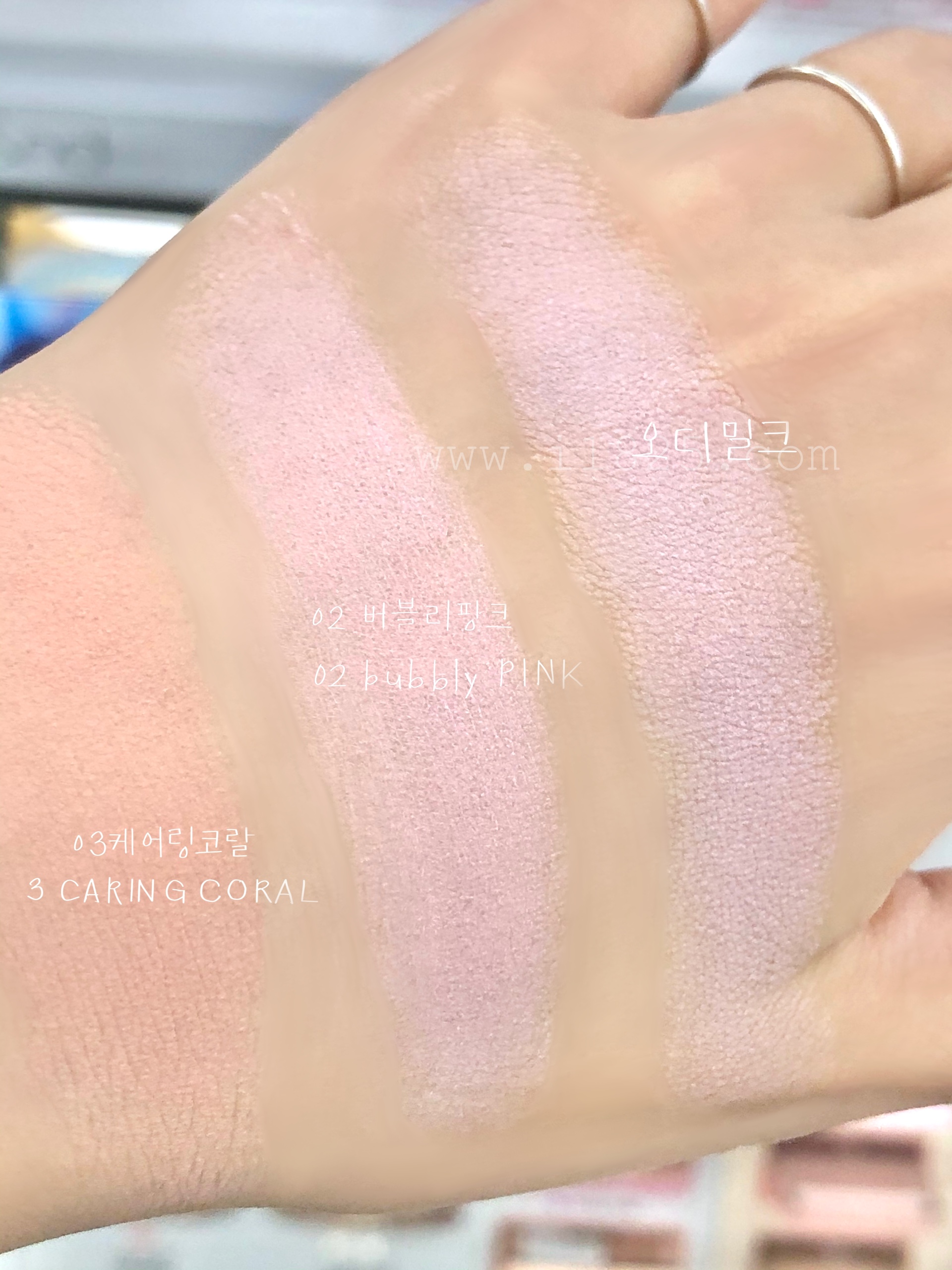 위 사진에서는 케어링 코랄의 붉은 기랑 형광 기가 너무 안 보여요. 실제 발색이랑 차이가 심한 사진으로 보랏빛 블러셔 버블리 핑크랑 오디 밀크만 확인해주세요.