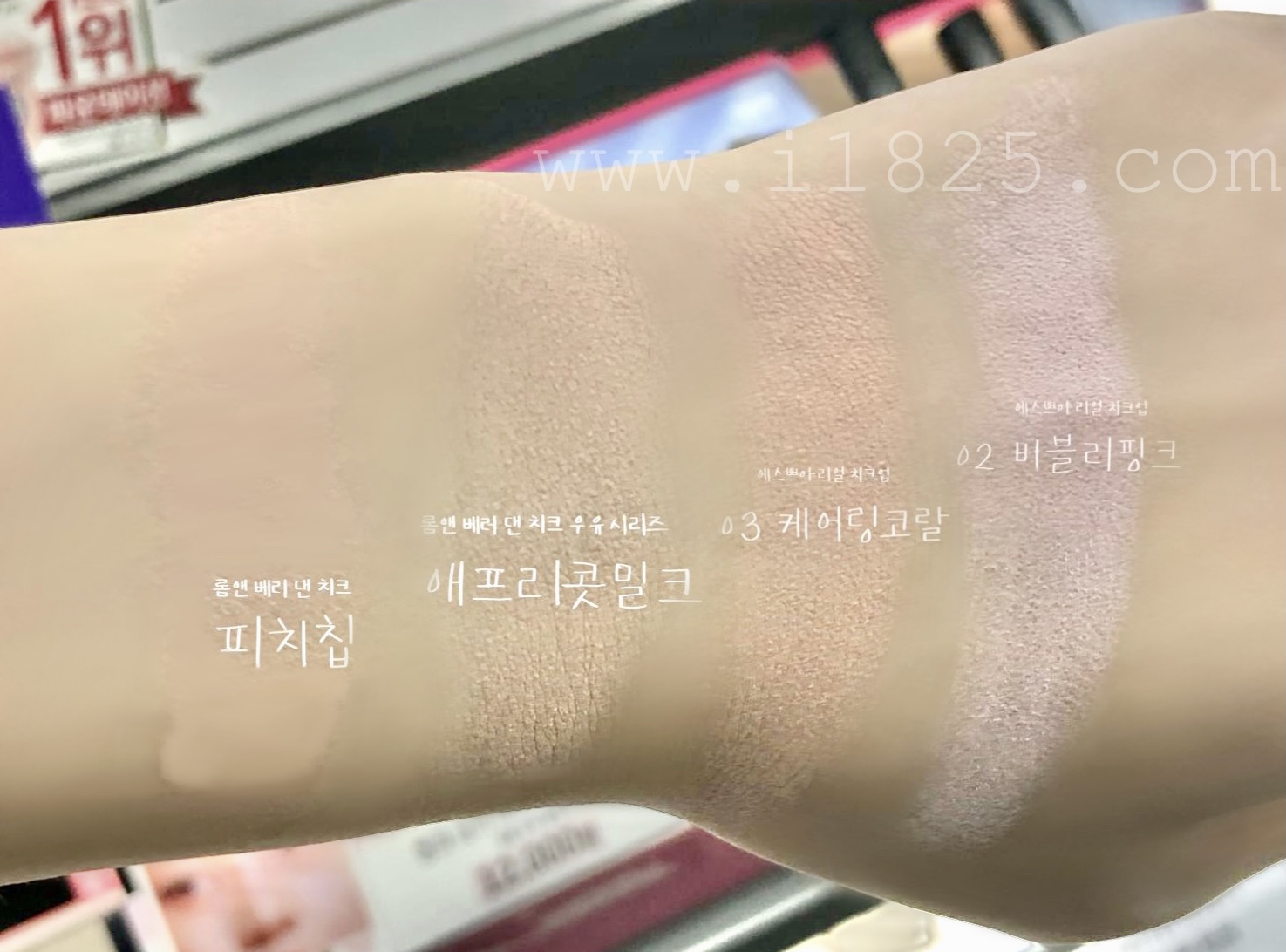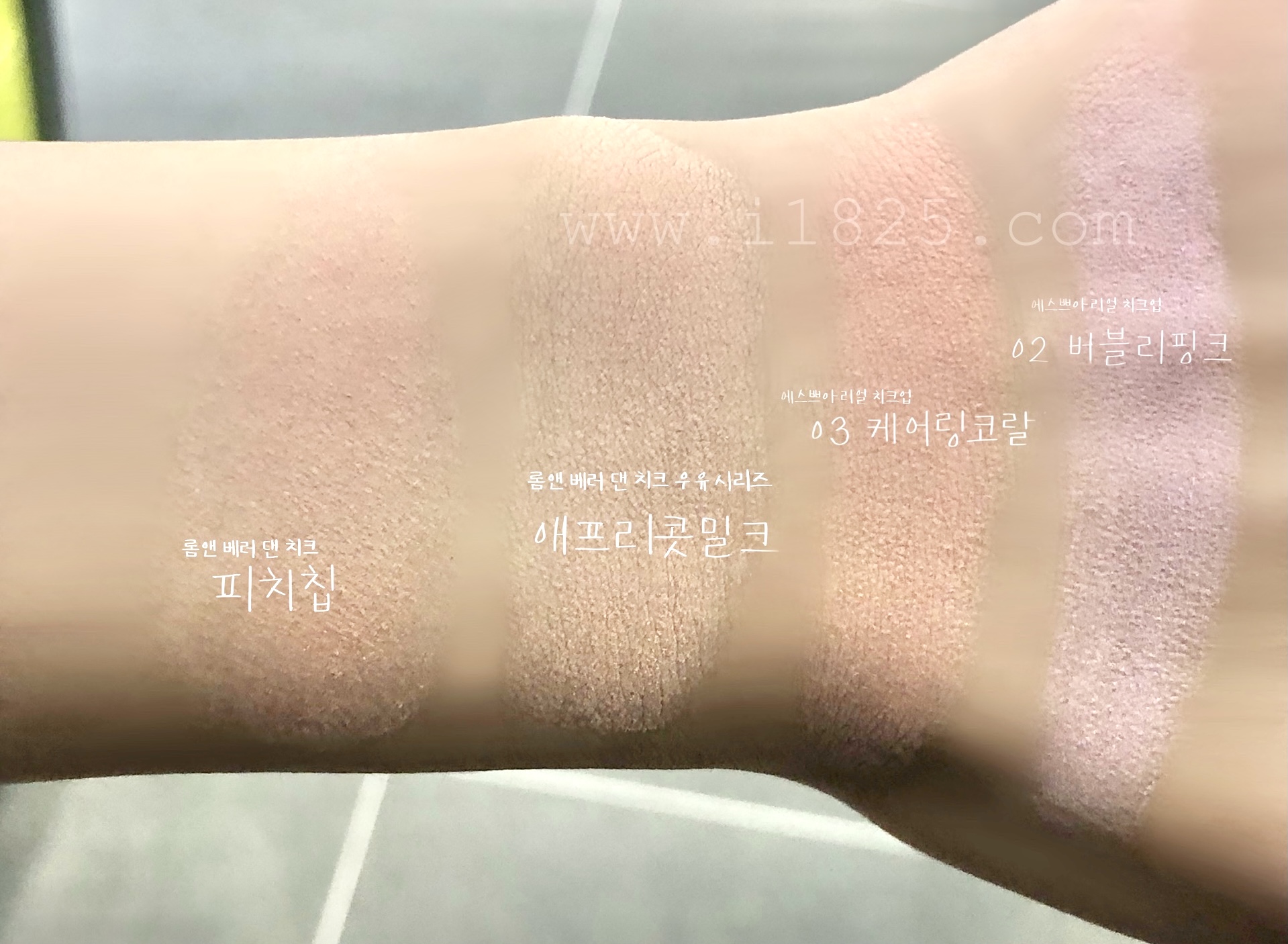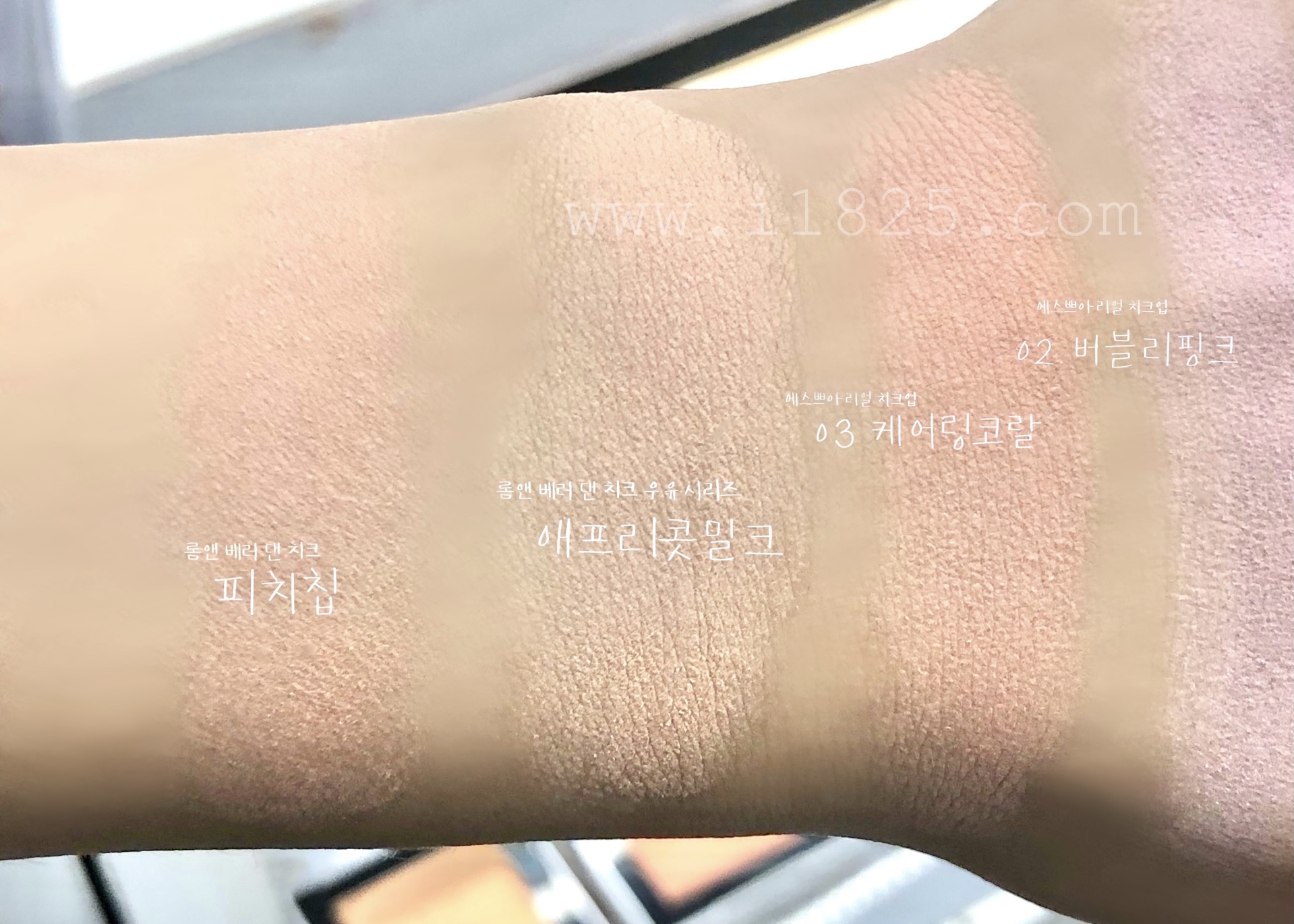 위 사진에서는 케어링 코랄의 붉은 기랑 형광 기가 너무 안 보여요. 실제 발색이랑 차이가 심한 사진으로 보랏빛 블러셔 버블리 핑크랑 오디 밀크만 확인해주세요.