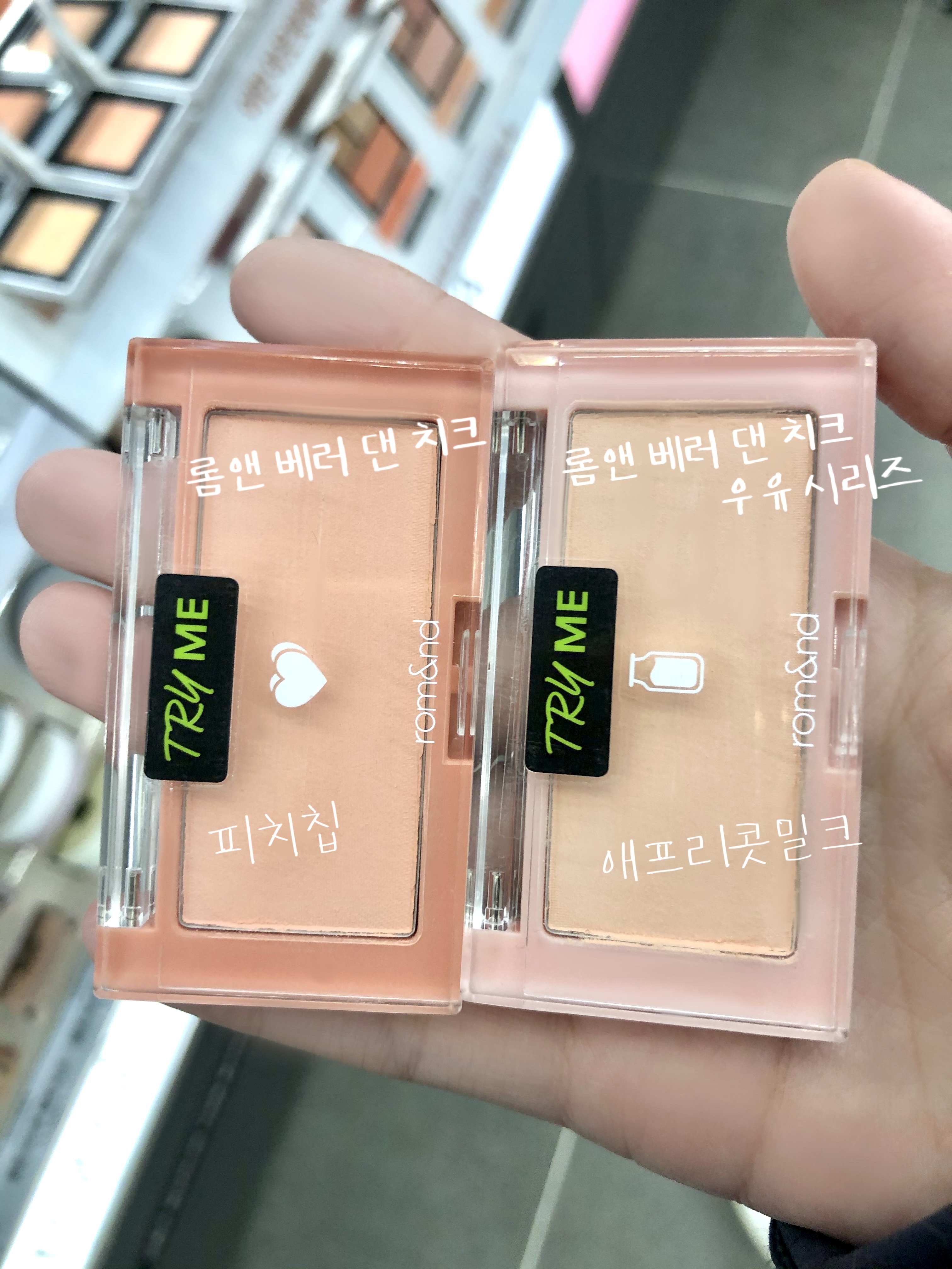롬앤 피치칩은 예전부터 나와있던 베러 댄 치크 시리즈의 오리지널 버전이구요, 애프리콧 밀크는 최근에 새로 나온 뽀얀, 명도 높은 브라이트에게 최적인 흰기 블러셔 우유 시리즈 중에 하나입니다.