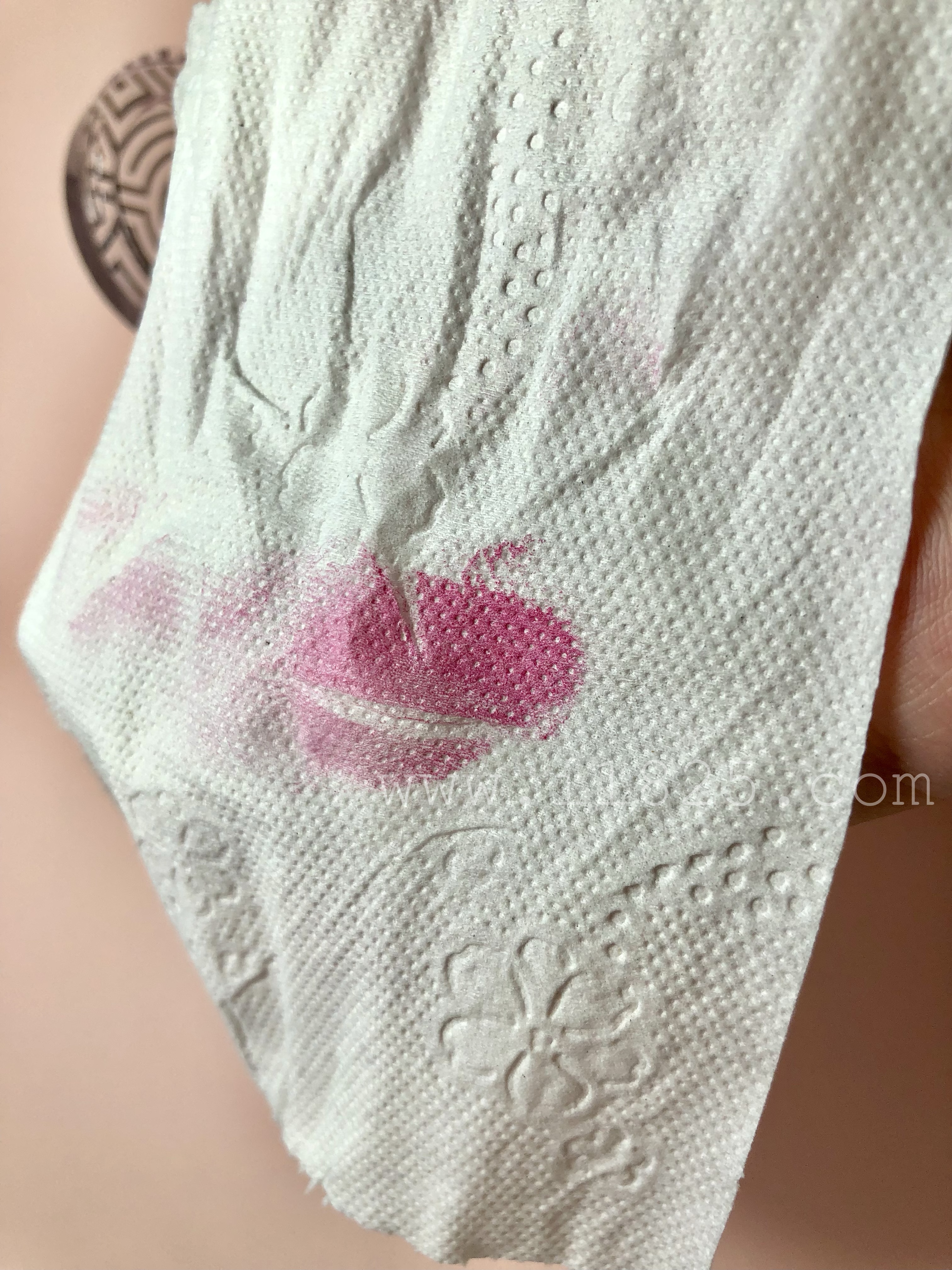 손가락에 발색한 블러셔 플럼 팝을 치우다 휴지에 묻은 발색이 너무 적나라해서 찍어보았어요. 역시나 자글자글한 펄은 잘 보이지 않아 티슈에 묻은 발색에서는 펄의 존재를 확인하기가 힘듭니다.