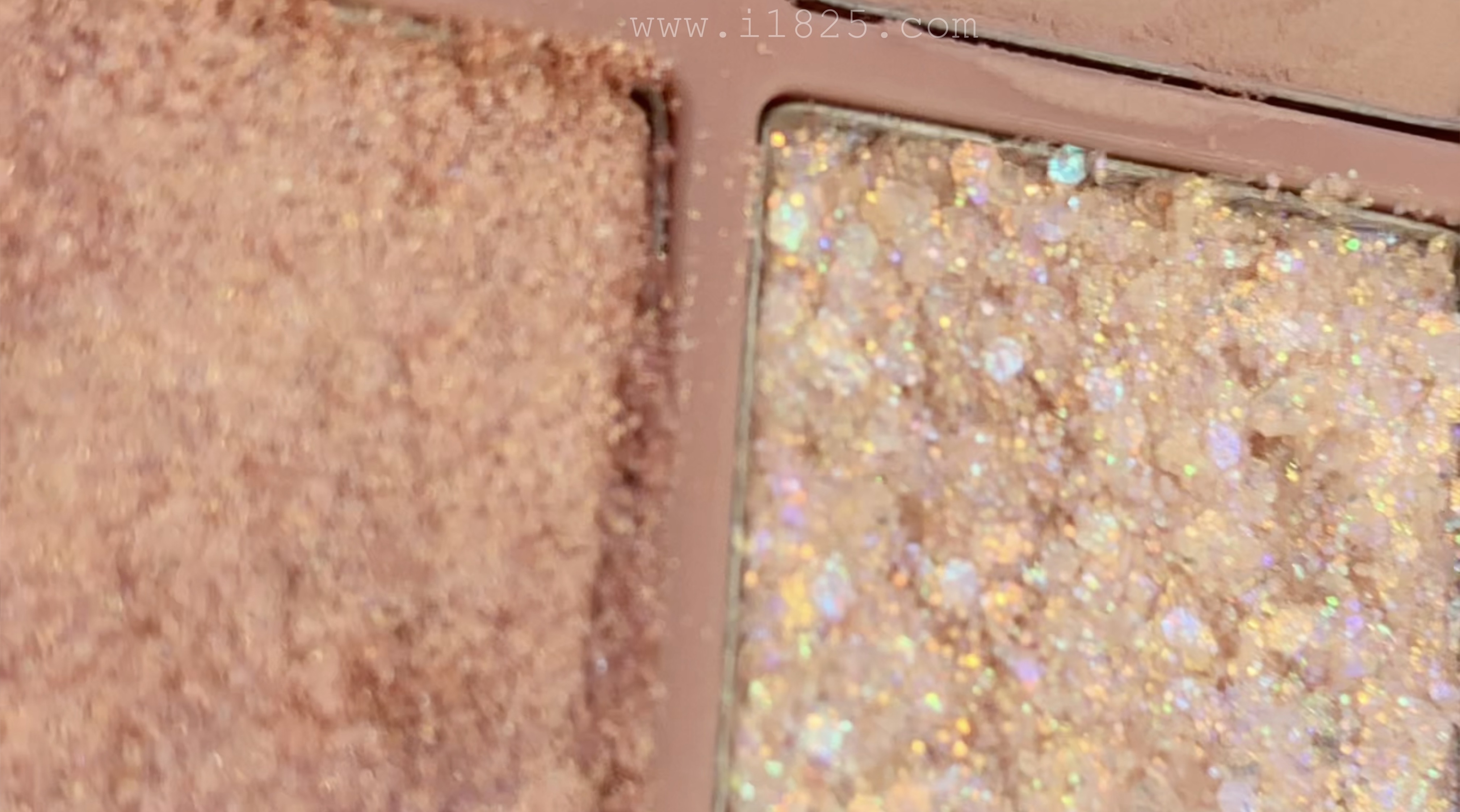 롬앤 베러 댄 팔레트 03 로즈버드 가든의 섀도우 GLITTER PEAK는 오팔 컬러의 육각 펄이 베이지 베이스 섀도우와 마구 섞여있어요.