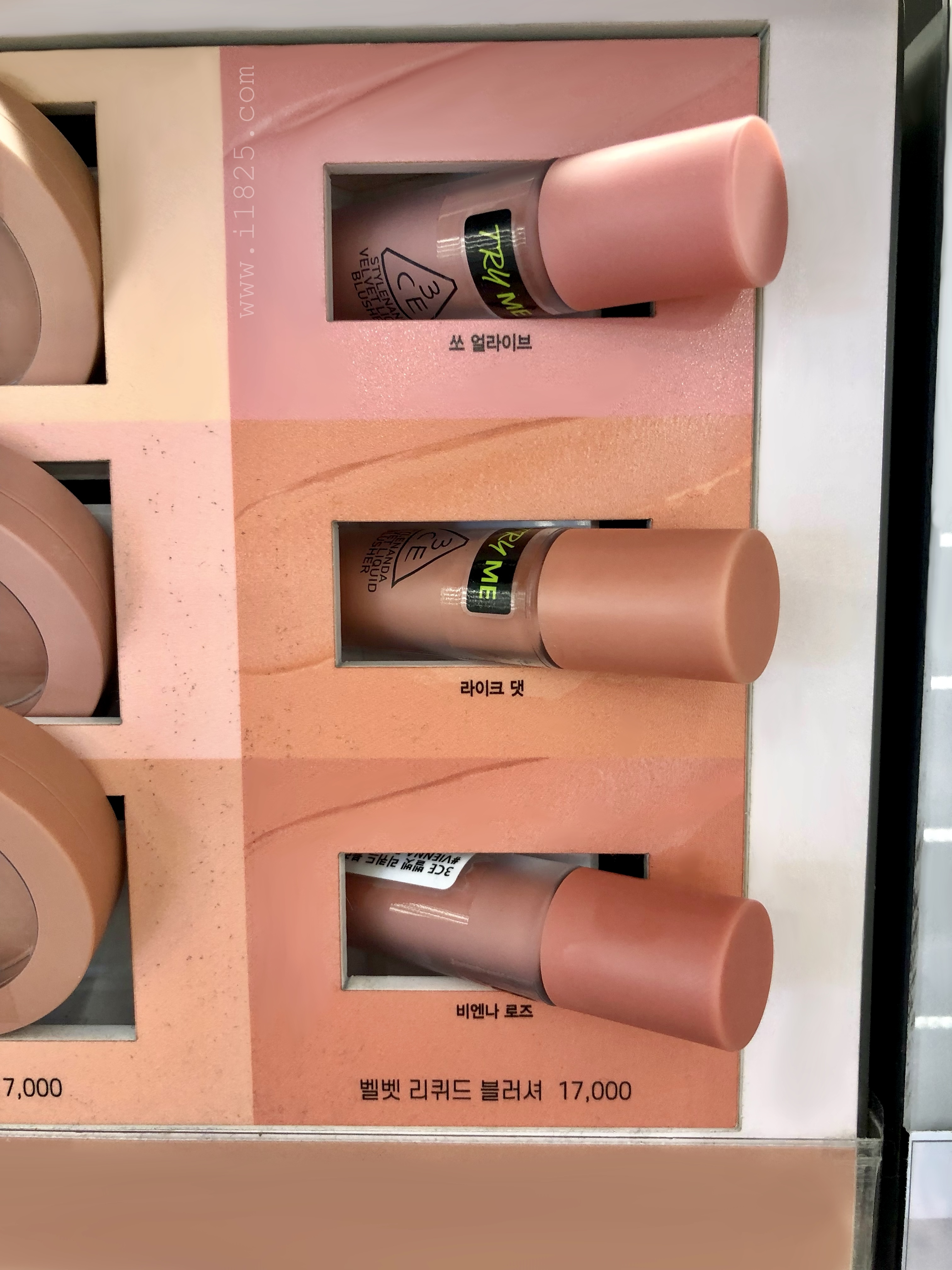 헌데 오프라인 올리브영 매장에는 보이다시피 3가지 색상만 진열되어 있던 시점으로 3CE 벨벳 리퀴드 블러셔의 5가지 제품 모두 소개하지 못하는 점 양해 바랍니다.
