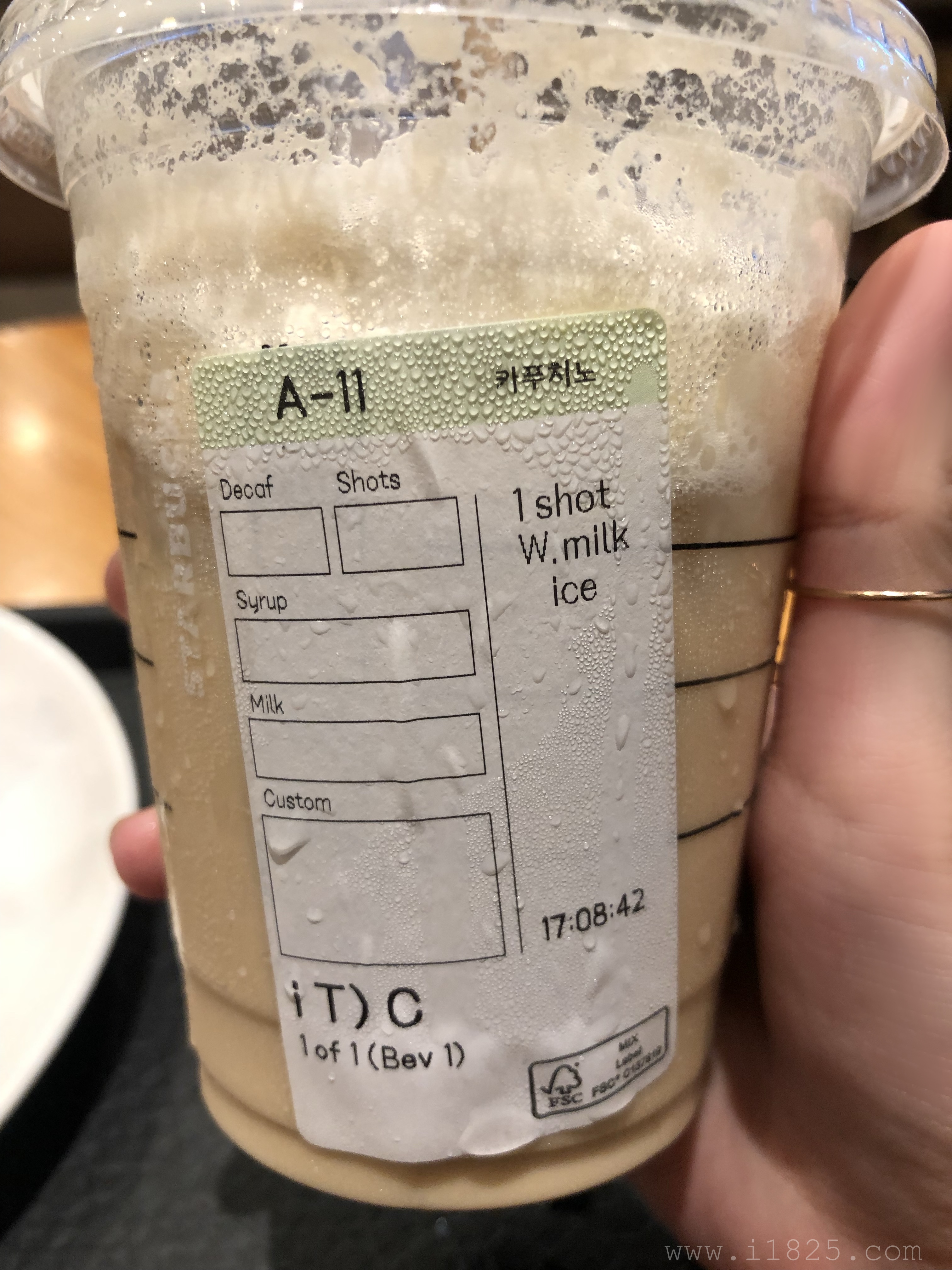 에스프레소 원 샷이 들어간 아이스 카푸치노 Tall 사이즈 하나.