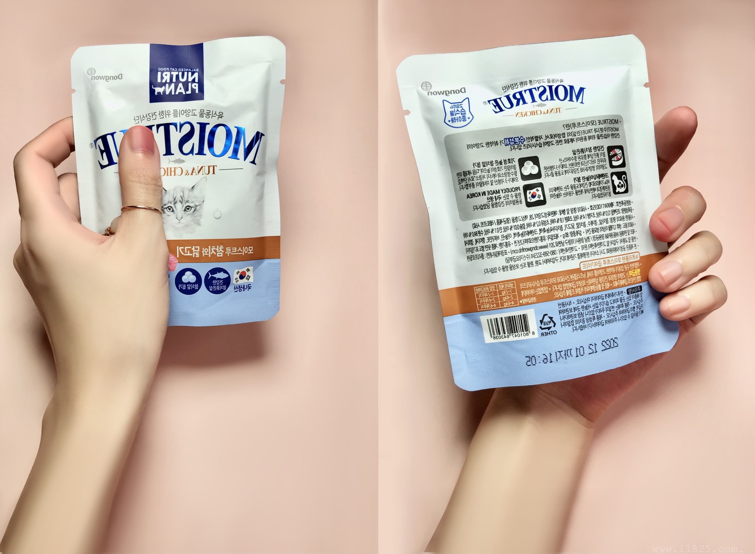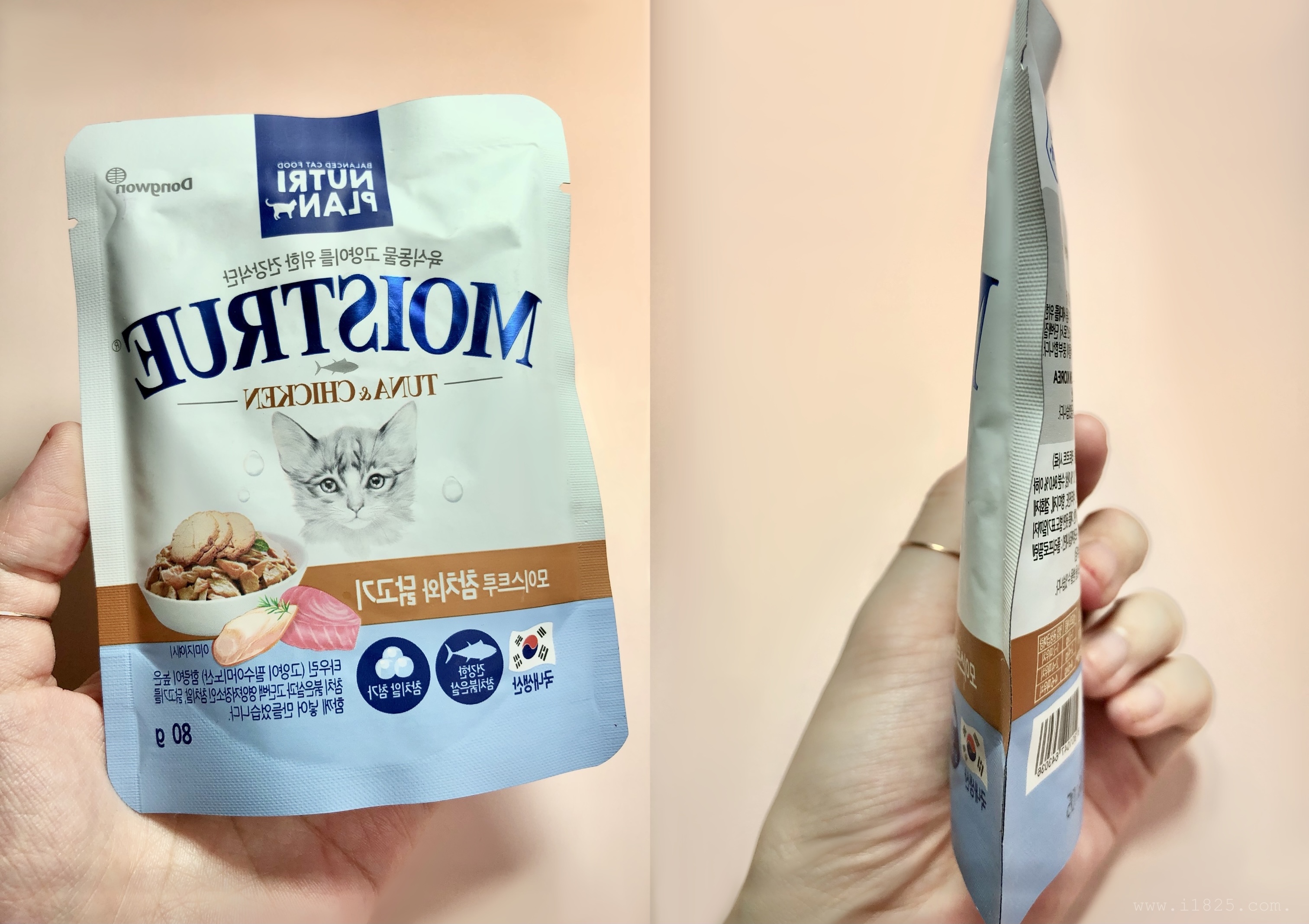 균형 잡힌 맛있는 고양이 사료!! 육식동물 고양이를 위한 영양 가득 촉촉한 건강식단 고양이 파우치 동원 뉴트리플랜 모이스춰 참치와 닭고기입니다.