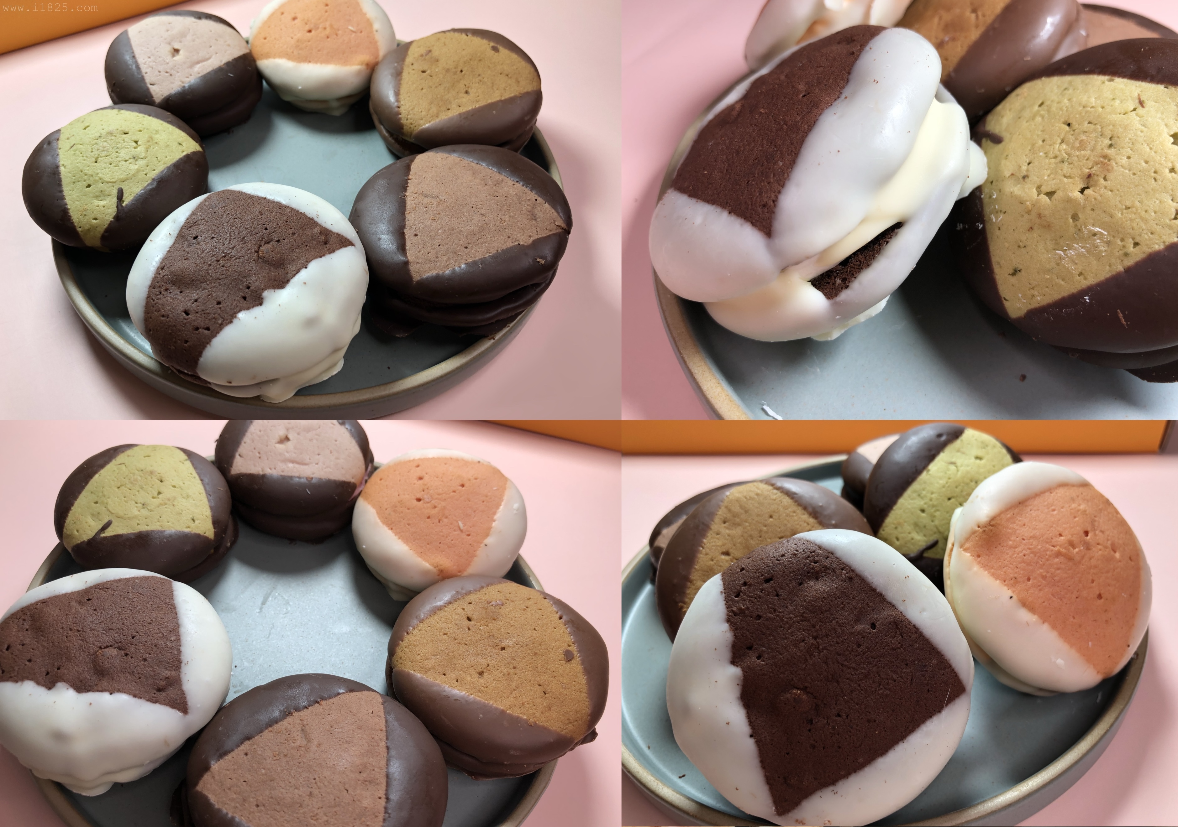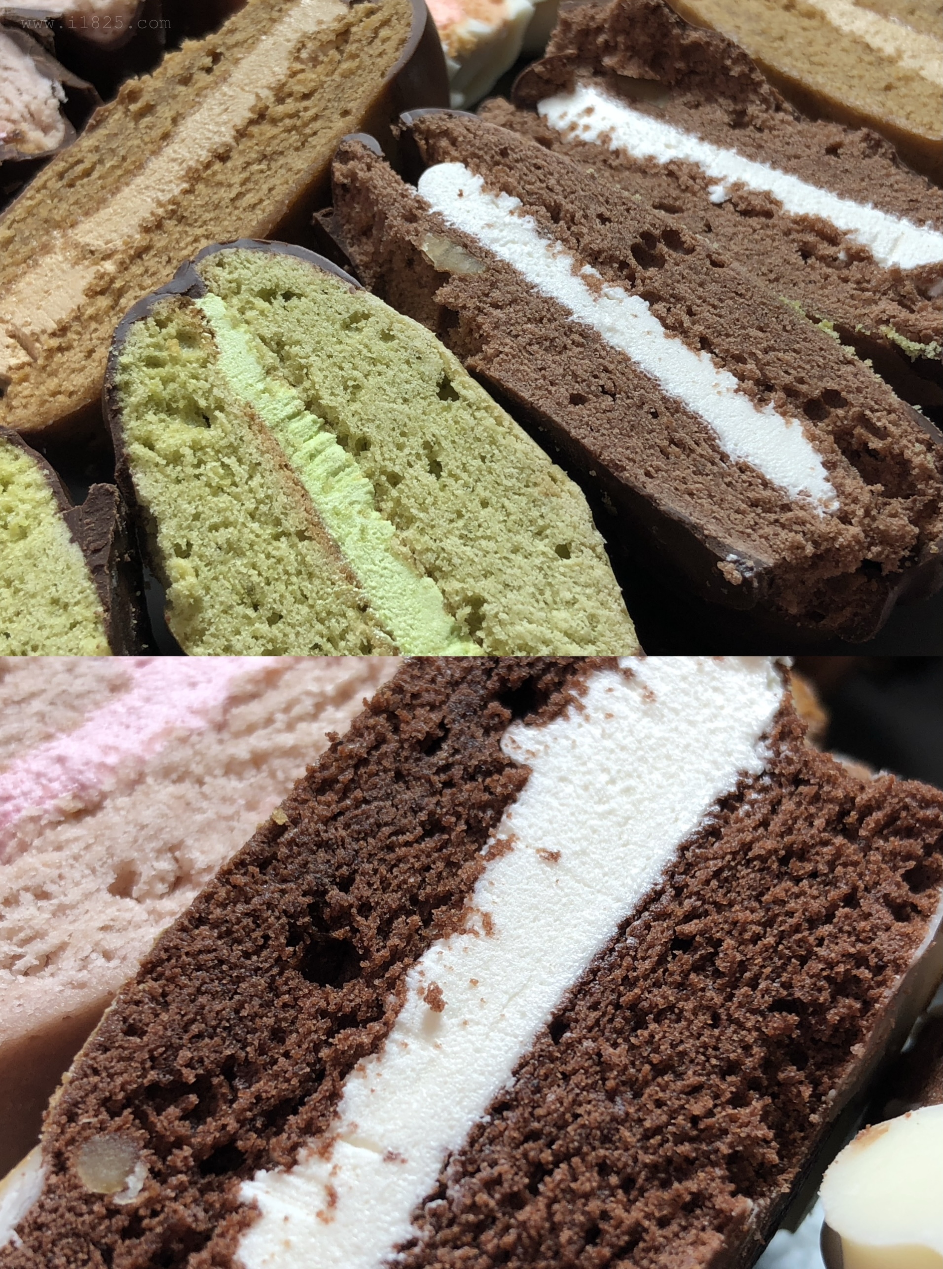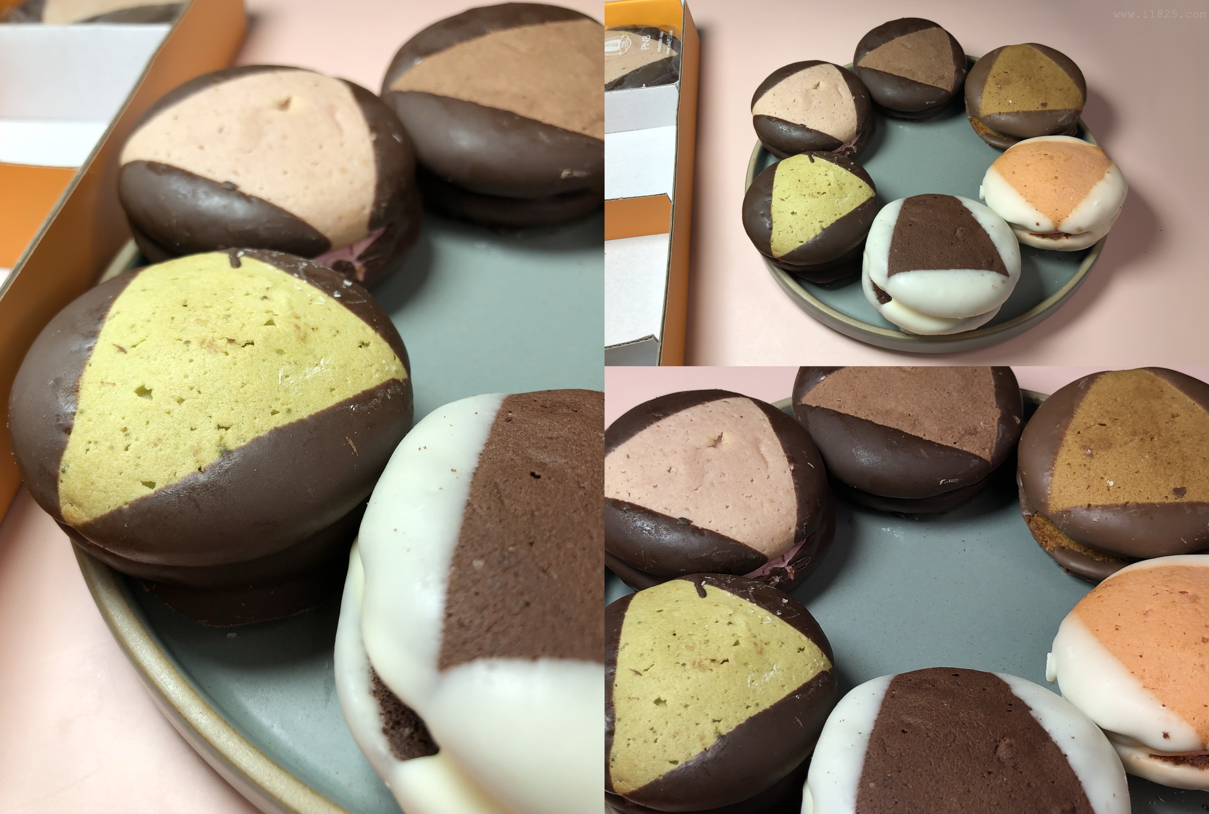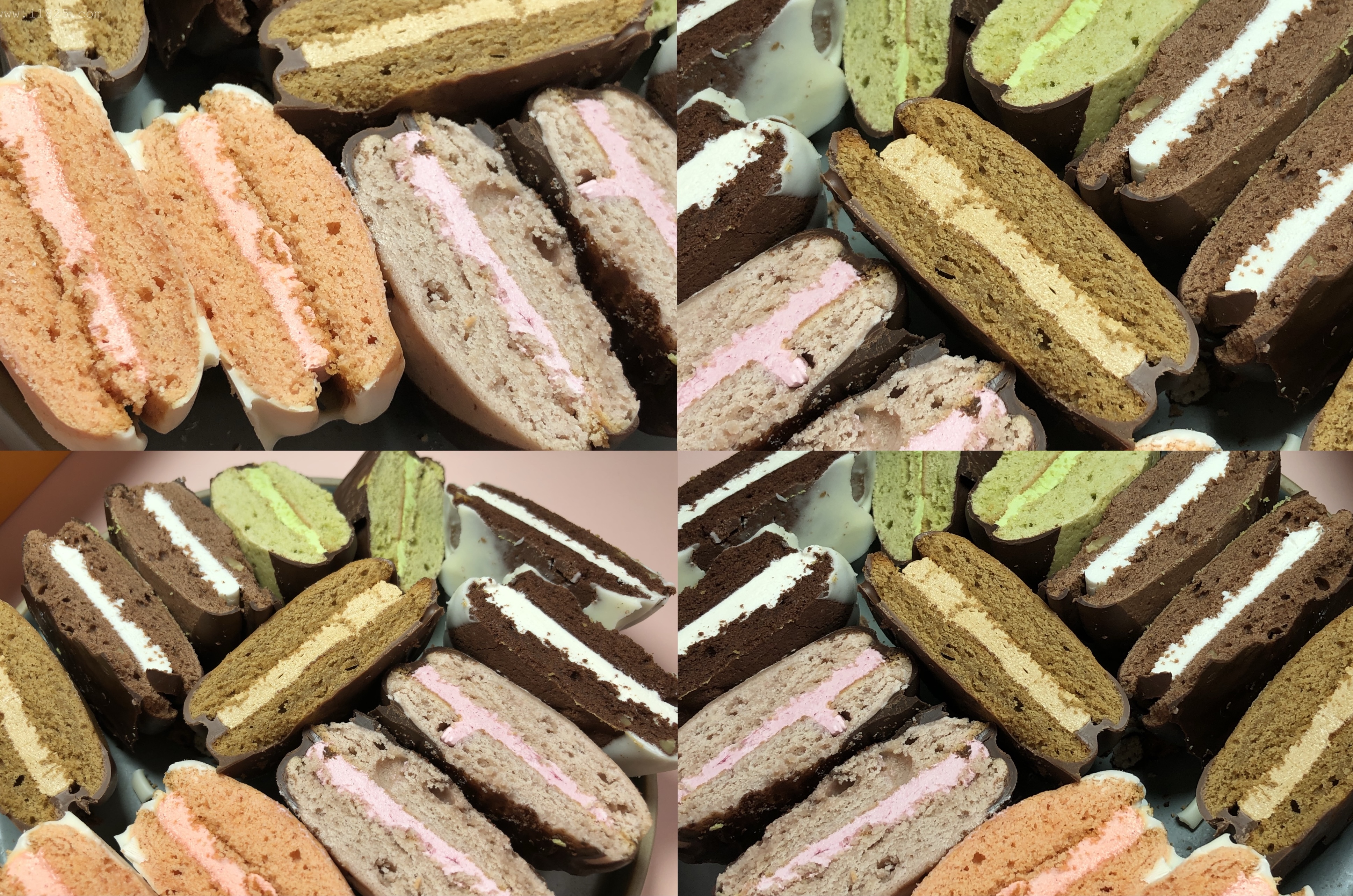 보이는 겉 빵, 속 빵, 크림의 색상만 다른 게 아니라 속에 들어가는 크림도 다 맛이 다르고, 빵의 맛도 달라요. 겉에 입힌 초코만 두 가지 블랫, 화이트 초코로 나뉘어 통일되어있으며 나머지는 하나하나 맛이 다 다릅니다.