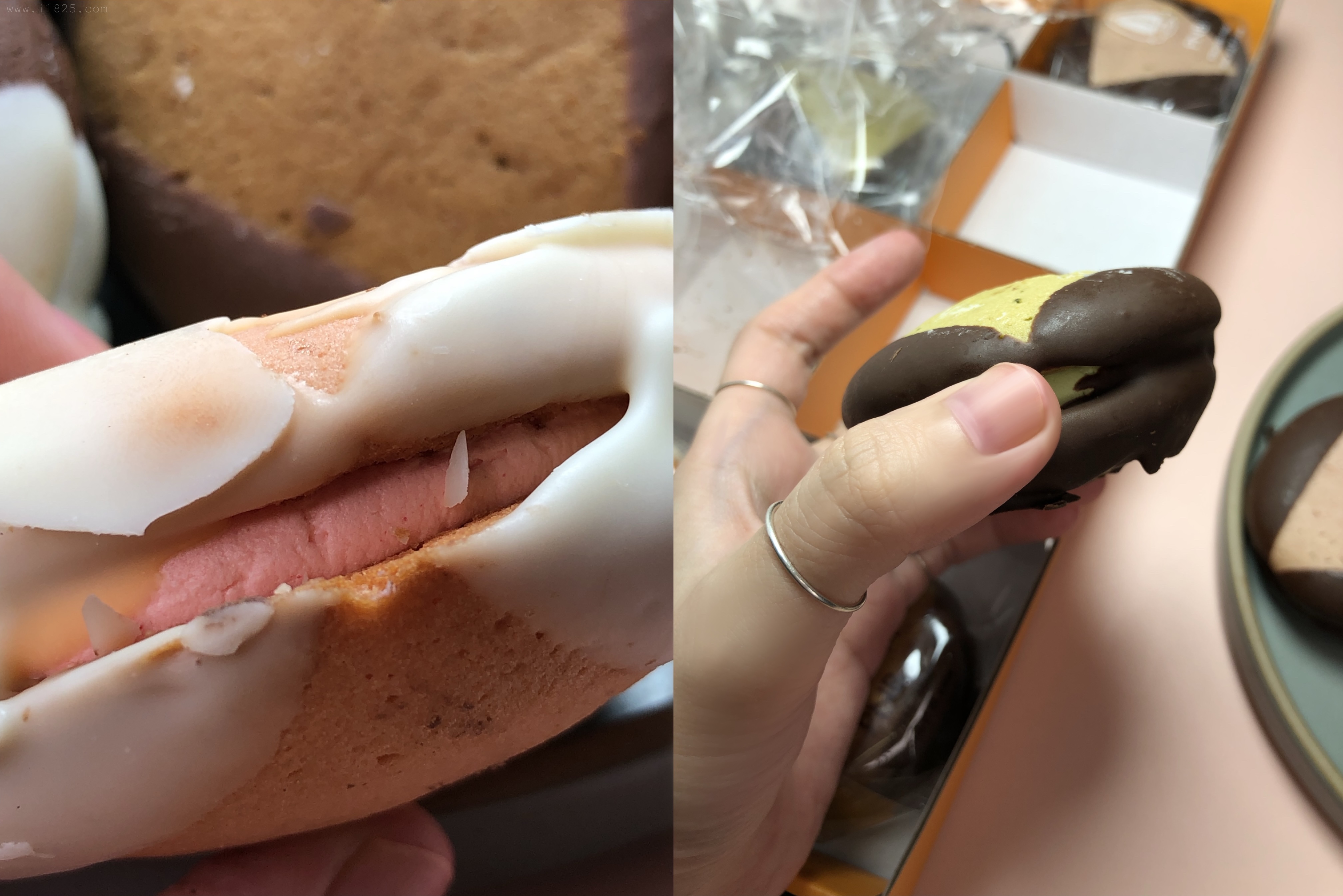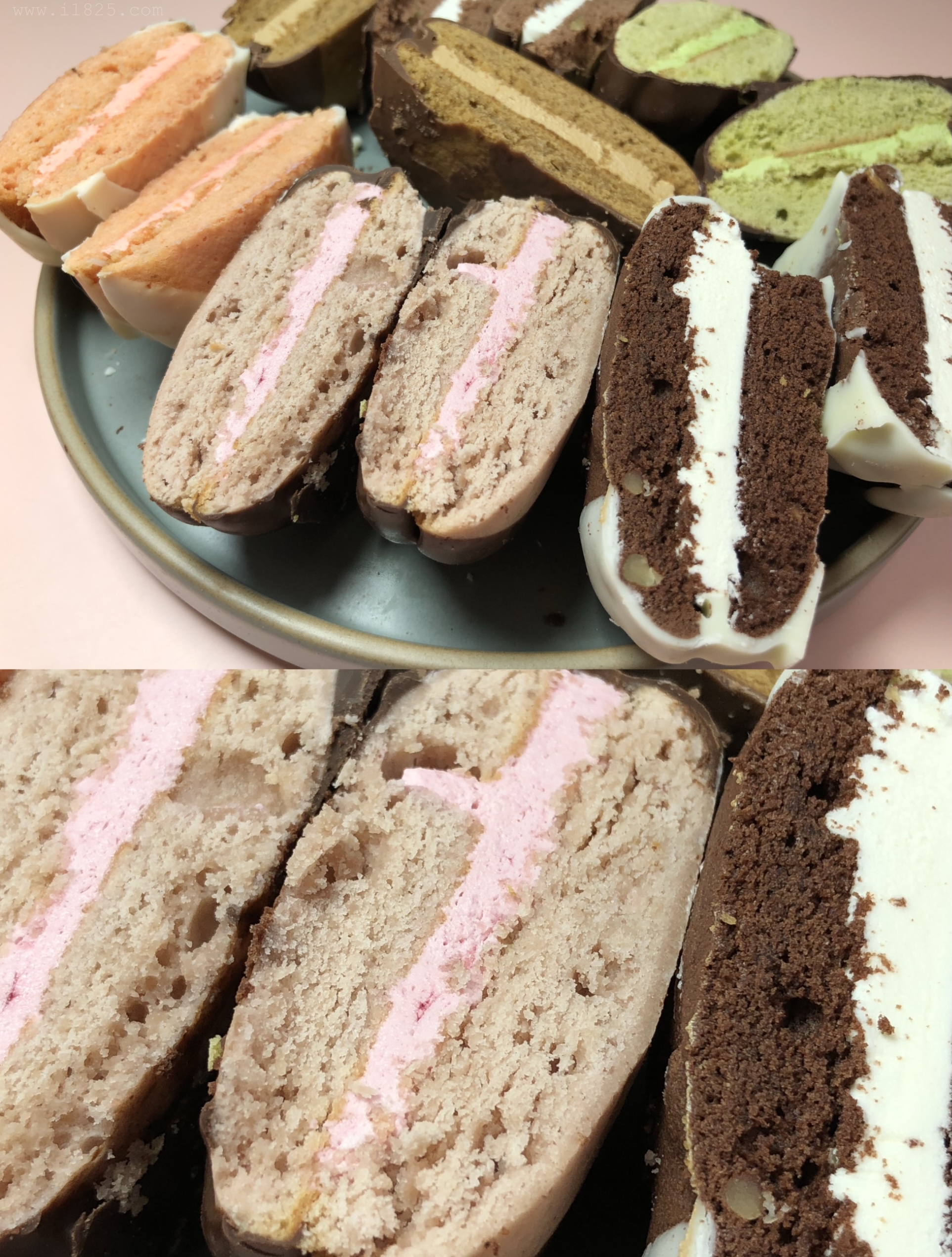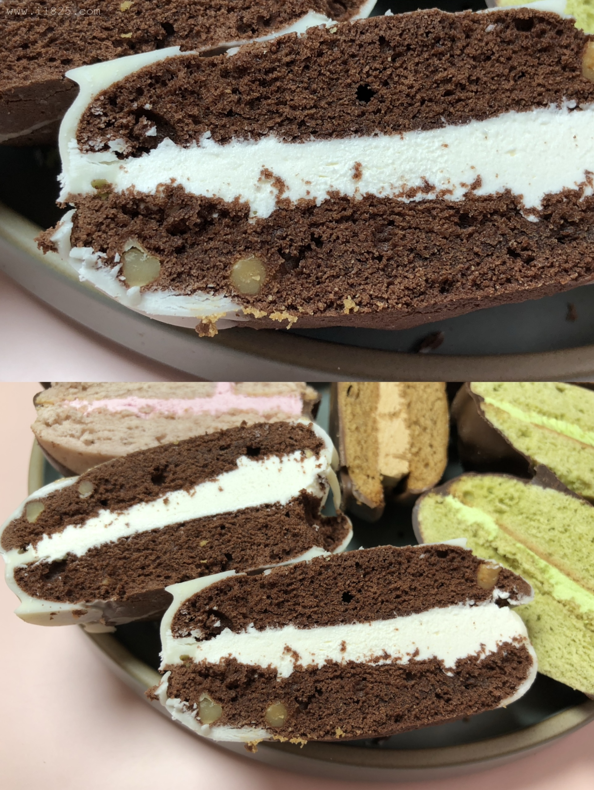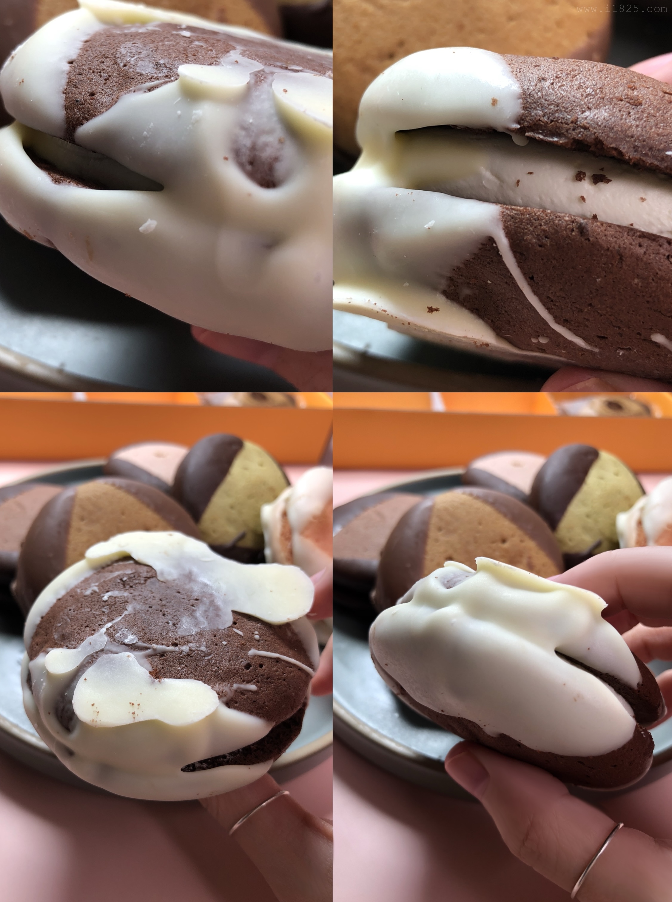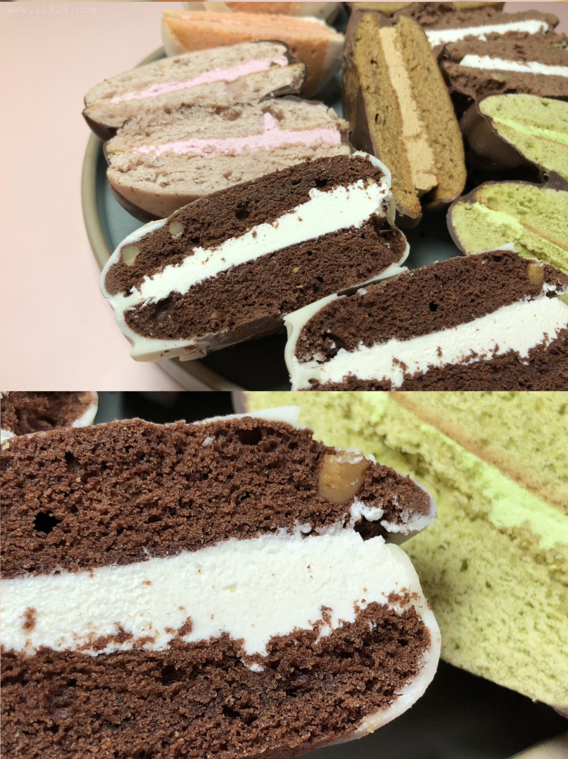보이는 겉 빵, 속 빵, 크림의 색상만 다른 게 아니라 속에 들어가는 크림도 다 맛이 다르고, 빵의 맛도 달라요. 겉에 입힌 초코만 두 가지 블랫, 화이트 초코로 나뉘어 통일되어있으며 나머지는 하나하나 맛이 다 다릅니다.