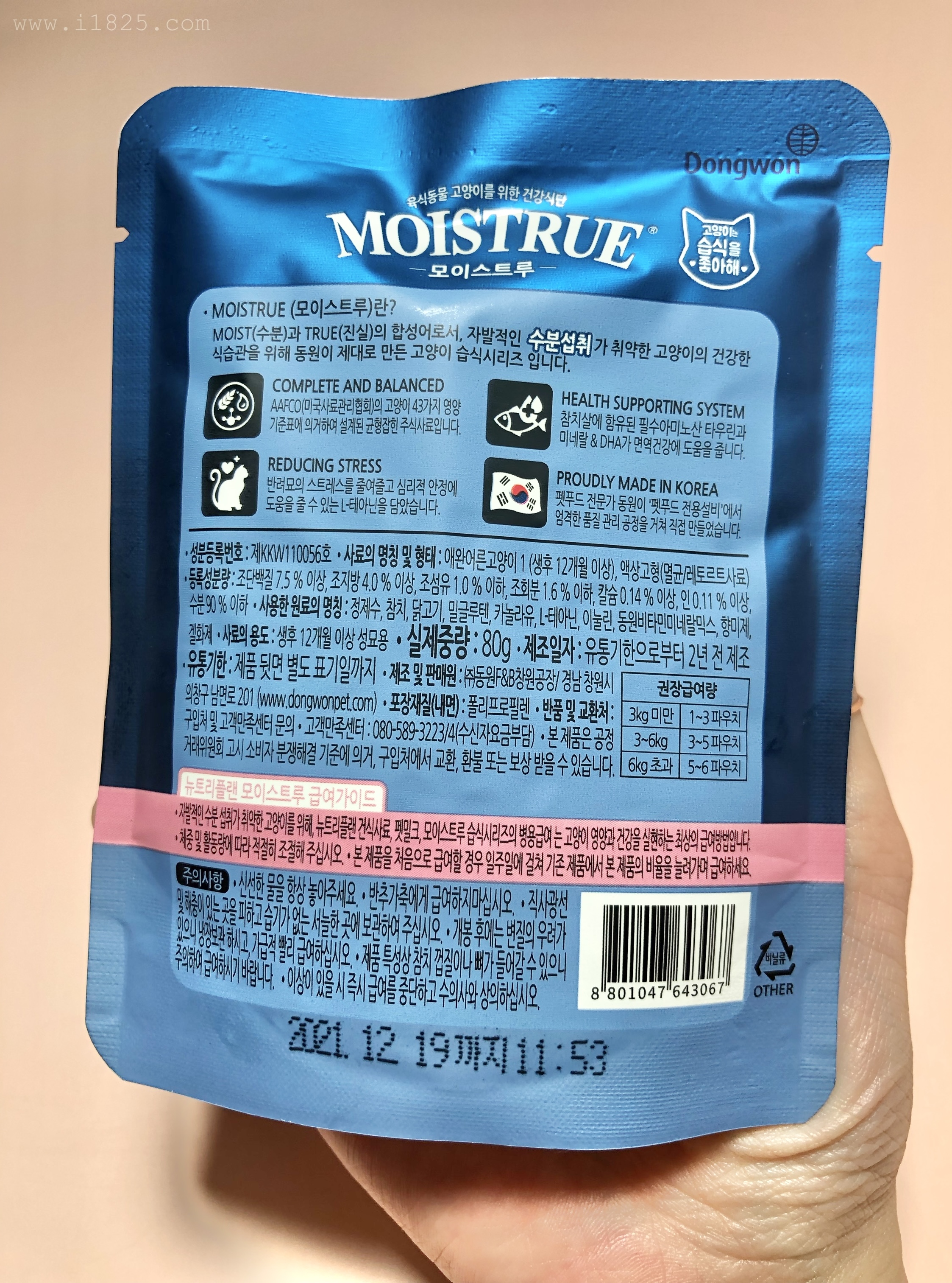 | 성분등록번호 : 제 KKW11056호 사료의 명칭 및 형태 : 생후 12개월 이상의 애완용 어른 고양이, 액상고형(멸균/레토르트사료) 등록성분량: 조단백질 7.5 % 이상, 조지방 4.0 %, 조회분 1.6 %, 칼슘 0.14 %, 인 0.11 %, 수분 90 % 이하 사용한 원료의 명칭 : 정제수, 참치, 닭고기, 카놀라유, 밀글루텐, L-테아닌, 이눌린, 도원비타민미네랄믹스, 향미제, 겔화제 사료의 용도 : 생후 12개월 이후의 성묘 고양이용 실제중량 : 80g 제조일자 : 유통기한으로부터 2년 전 제조 되었습니다. 유통기한은 제품 뒷면에 별도로 표기되어있습니다. 제조 및 판매원 : (주)동원 F&B창원공장/ 경남 창원시 의창구 남면로 201(www.dongwonpet.com) 포장재질 (내면) : 폴리프로필렌 반품 및 교환처 : 제품의 구입처 및 고개만족센터에서 문의 가능합니다. 고객만족센터 : 080-589-3223/4(수신자 요금 부담입니다) ※본 제품은 공정거래위원회 고시 소비자 분쟁해결 기준에 의거 구입처에서 교환 또는 환불, 보상을 받을 수 있습니다. |