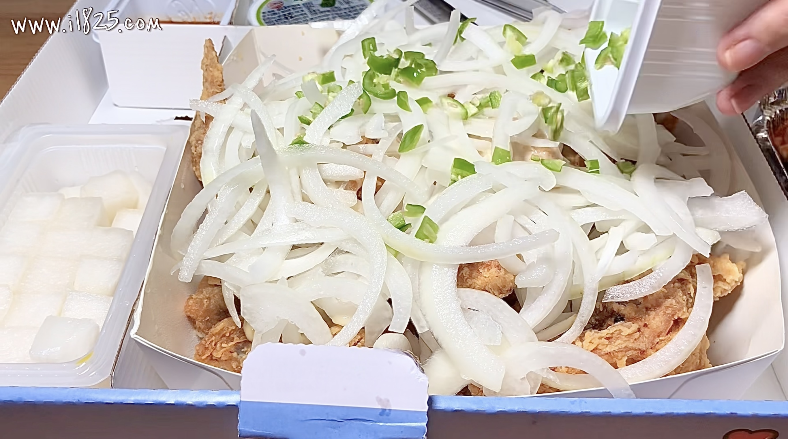 네네 치킨의 네네 청양마요 치킨은 이렇게 양파를 얹고 청양고추를 얹은 후 네네 청양마요 소스를 마지막으로 마무리하면 세팅 완료!!입니다.