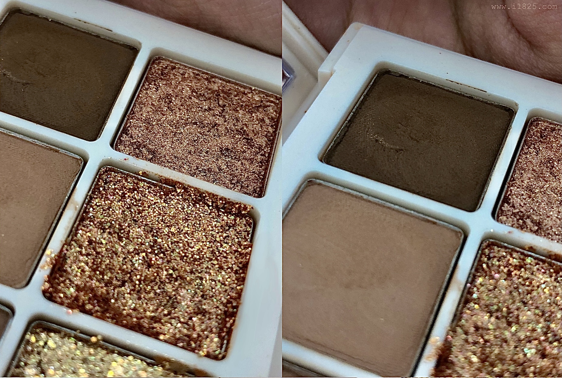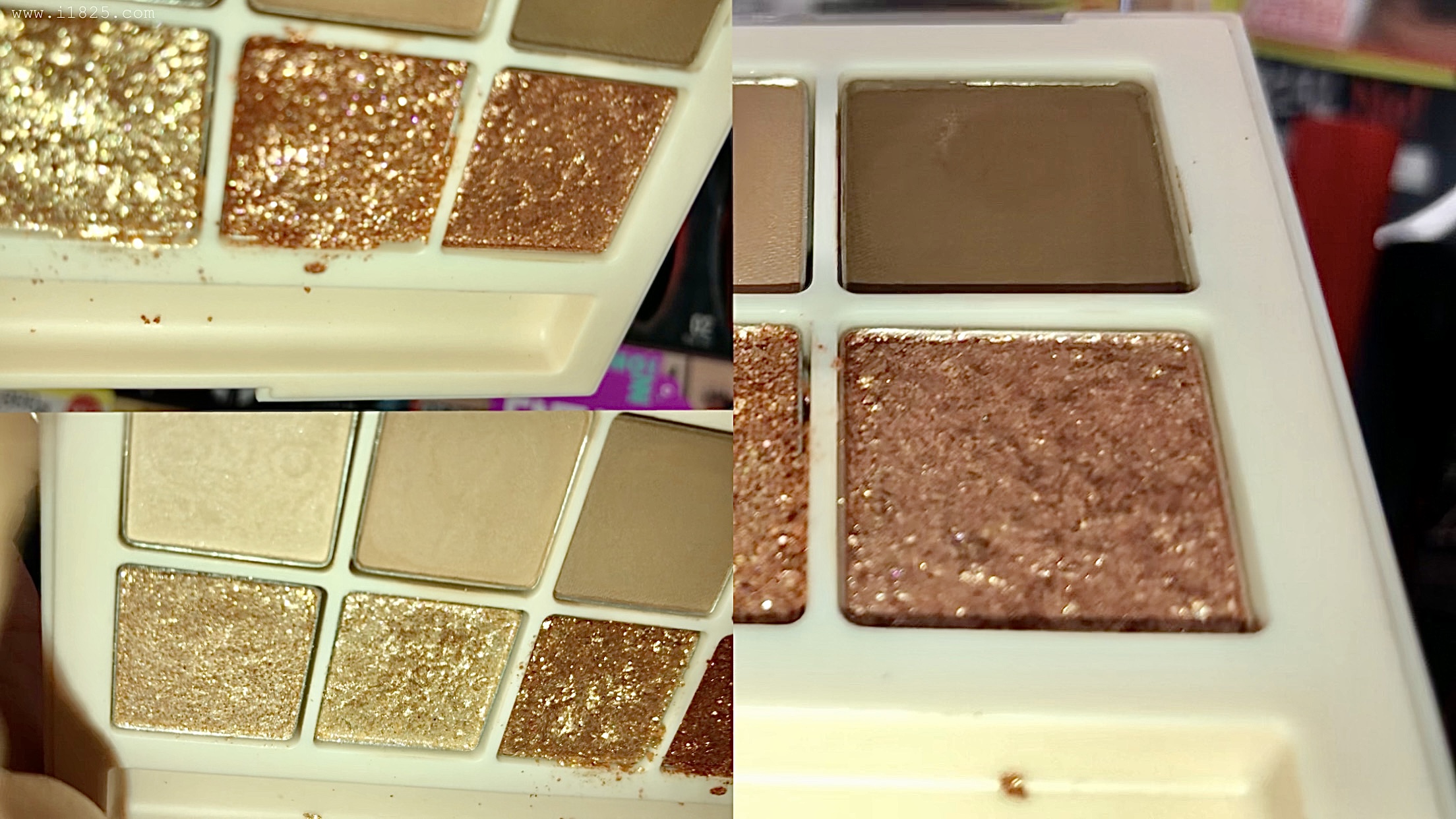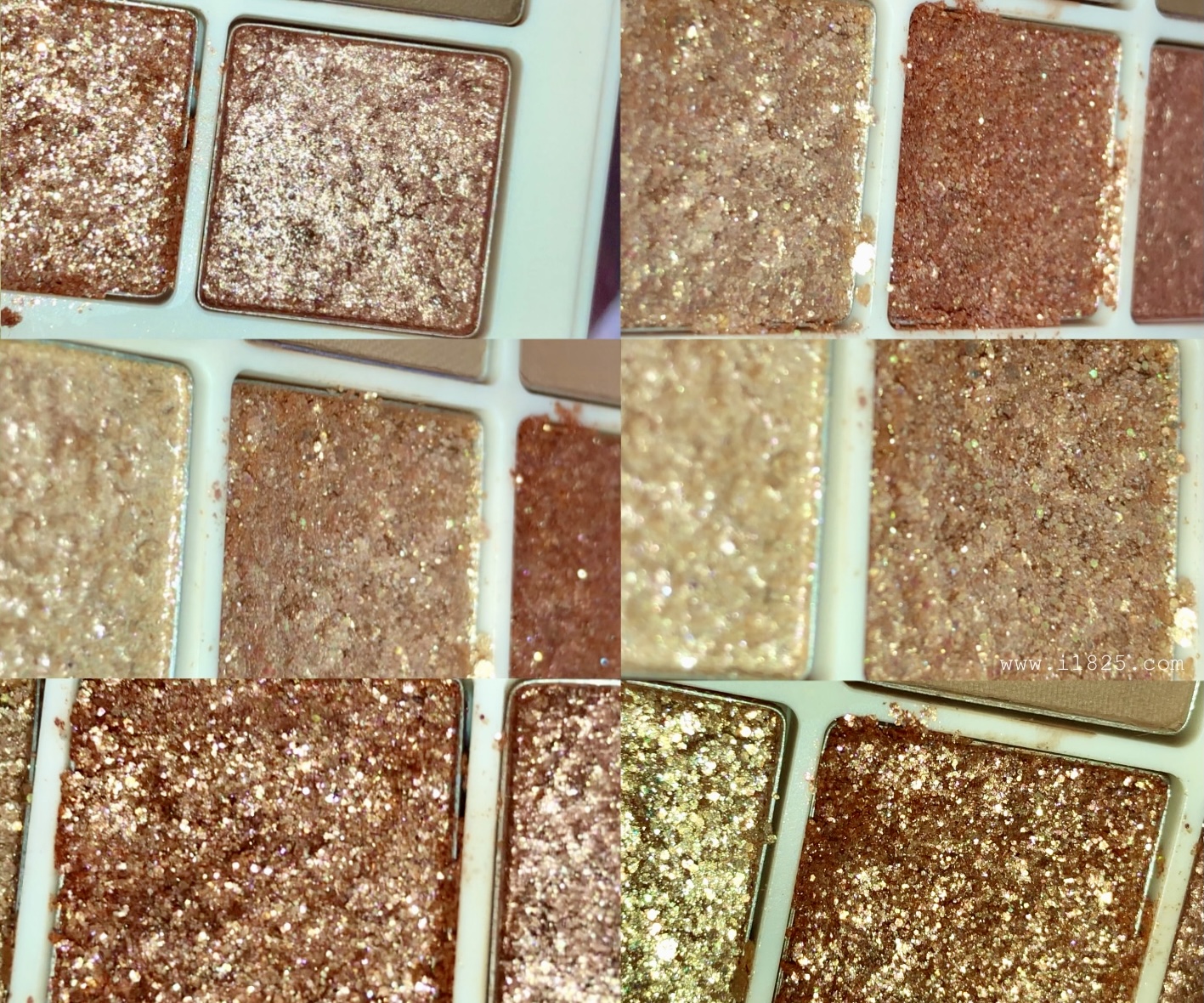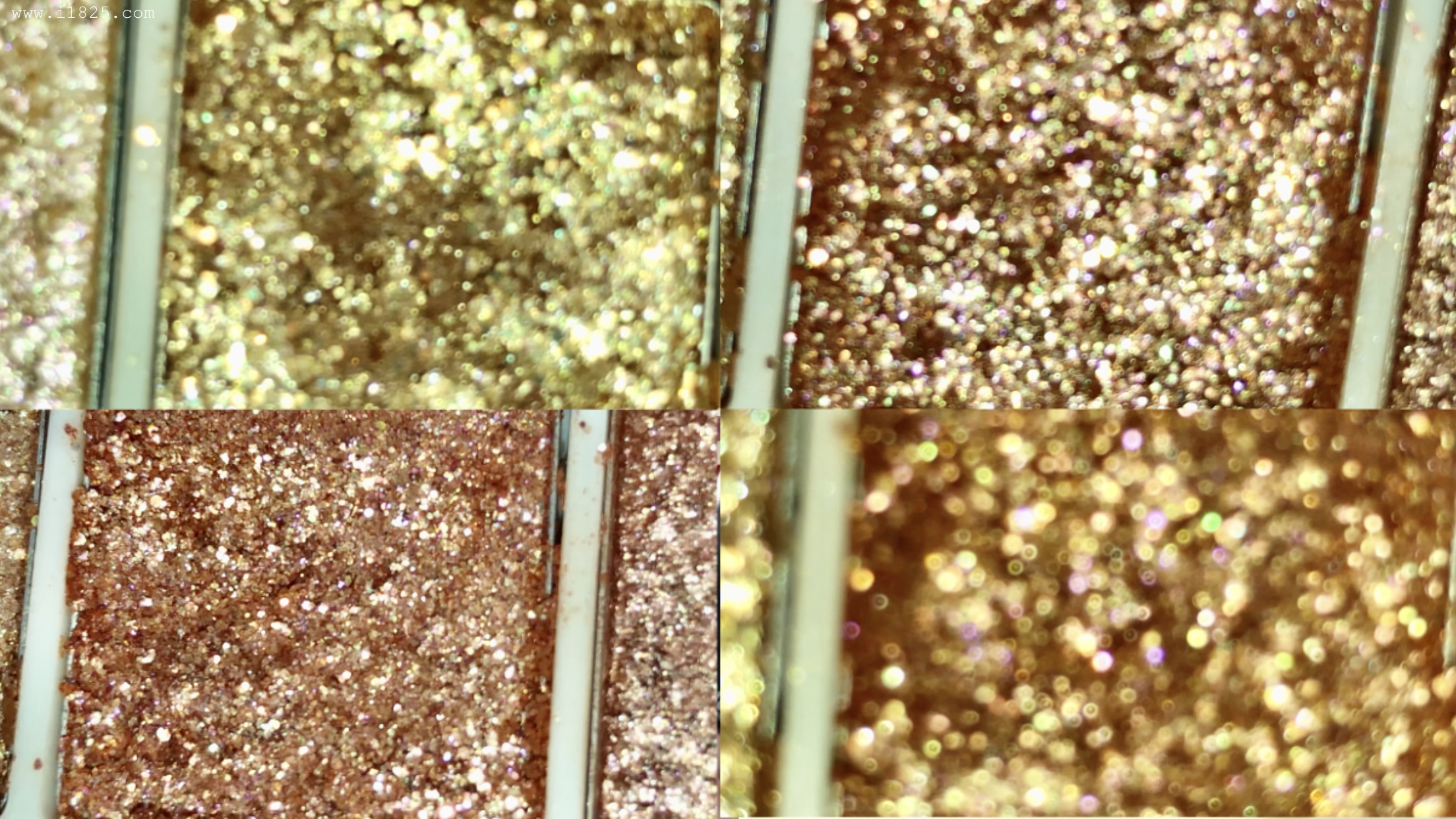 | 살짝 옐로우 스킨톤 베이지 컬러의 펄 섀도우 | 자연스러운 피부톤에 가장 흡사한 핑키쉬한 잘은 펄 스킨톤 아이보리 컬러의 베이지 펄 섀도우 | 옐로우 골드톤 팔레트에서 가장 큰 육각 글리터 펄 파츠의 현란한 섀도우 | 골드 스피릿 보다 작은 알갱이의 글리터 펄이 자글한 로즈골드톤 글리터 펄 섀도 | 붉게 빛나는 블링 눈매를 만들어주는 핑키쉬한 로즈골드톤 펄 섀도우 |