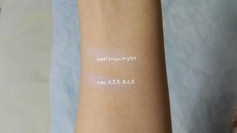 위에서부터 바비브라운 쉬머 워시 아이섀도 07 라일락, 맥 엑스트라 디멘션 스킨 피니쉬 하이라이터 - 소프트 프로스트입니다.