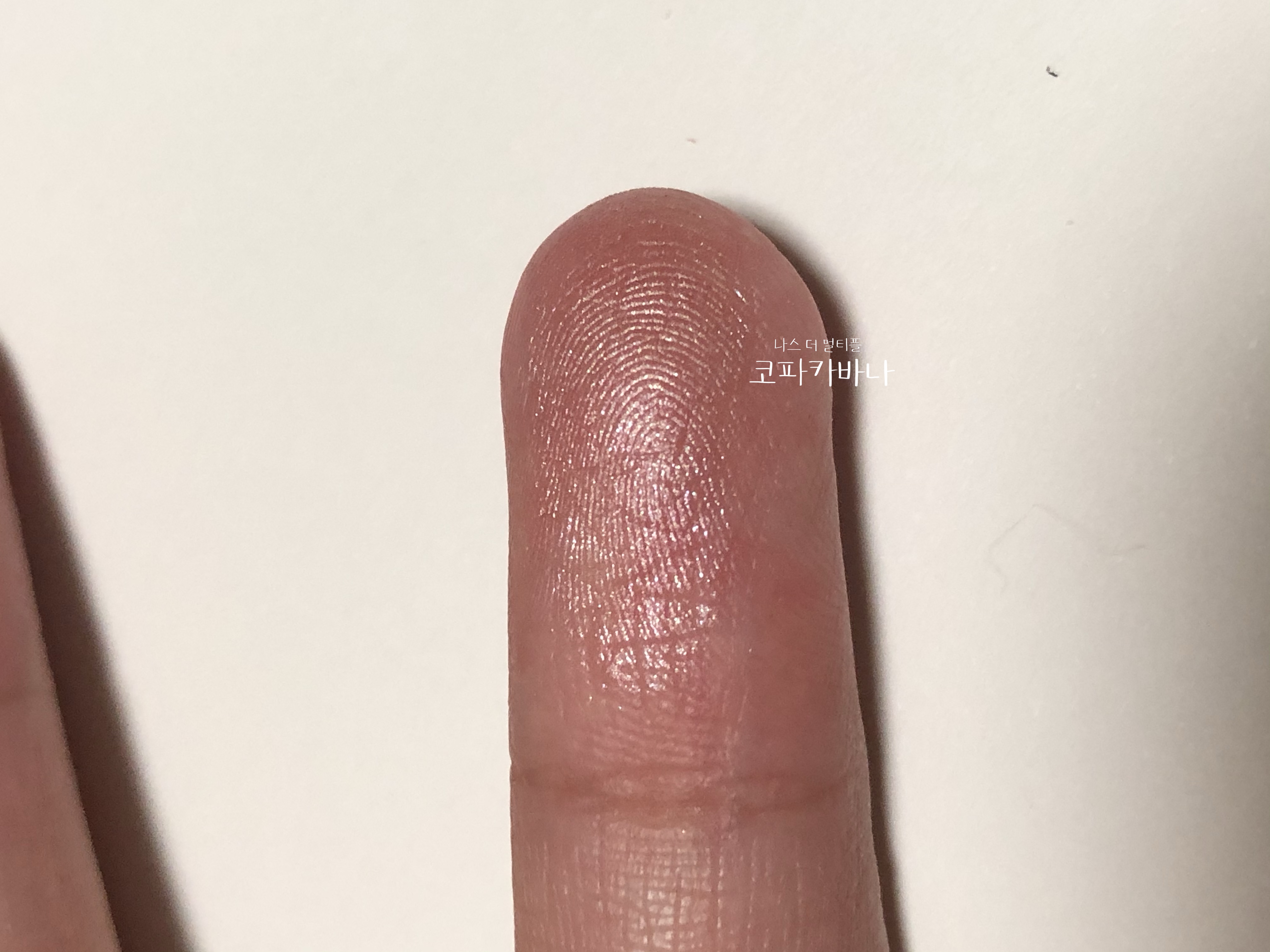 이상하게도 화이트 펄에서 살짝 핑크빛이 보여요. 인위적인 펄감이 나기 때문에 자연스럽기보다 확실한 하이라이터 효과를 볼 수 있습니다.