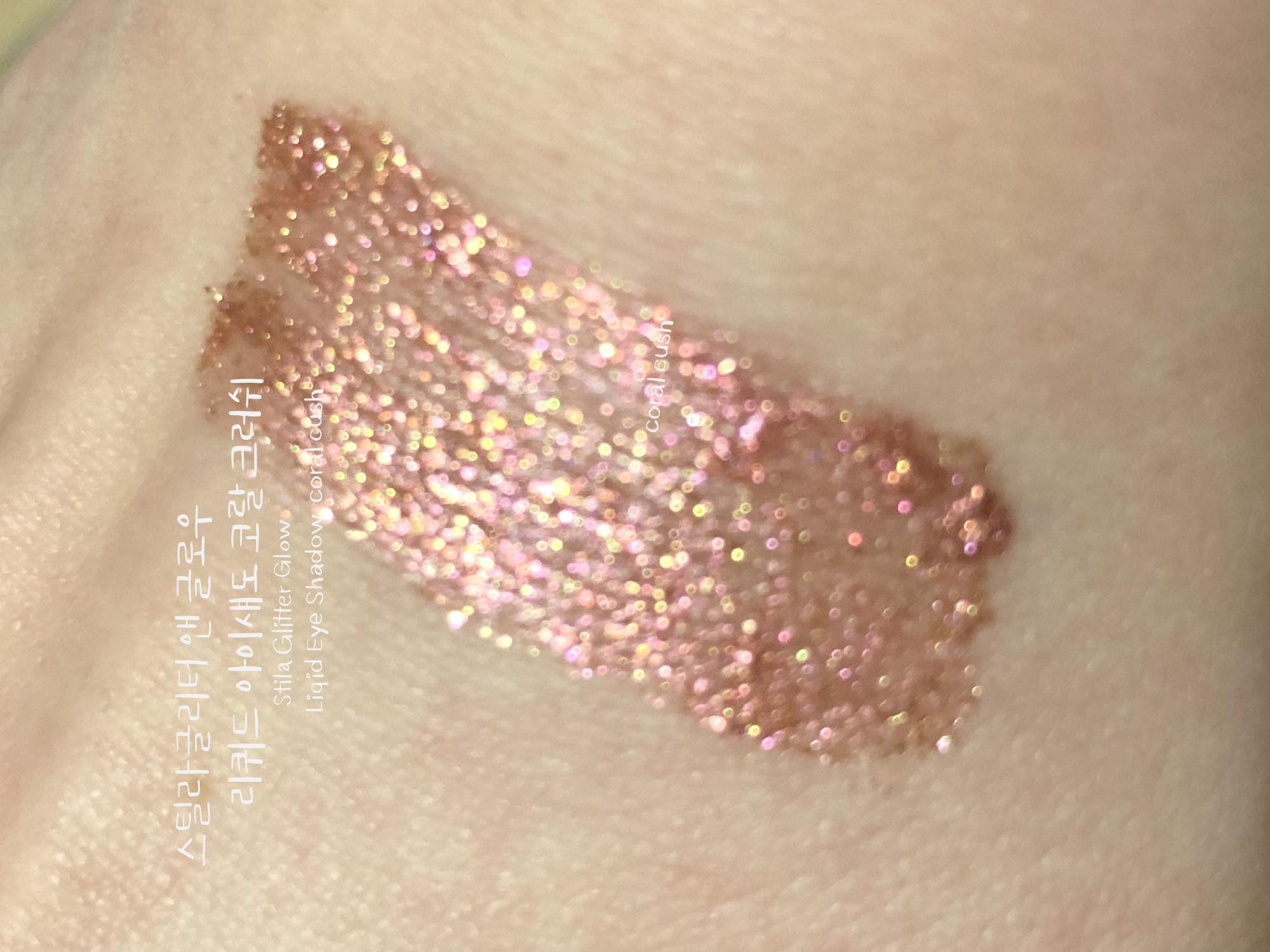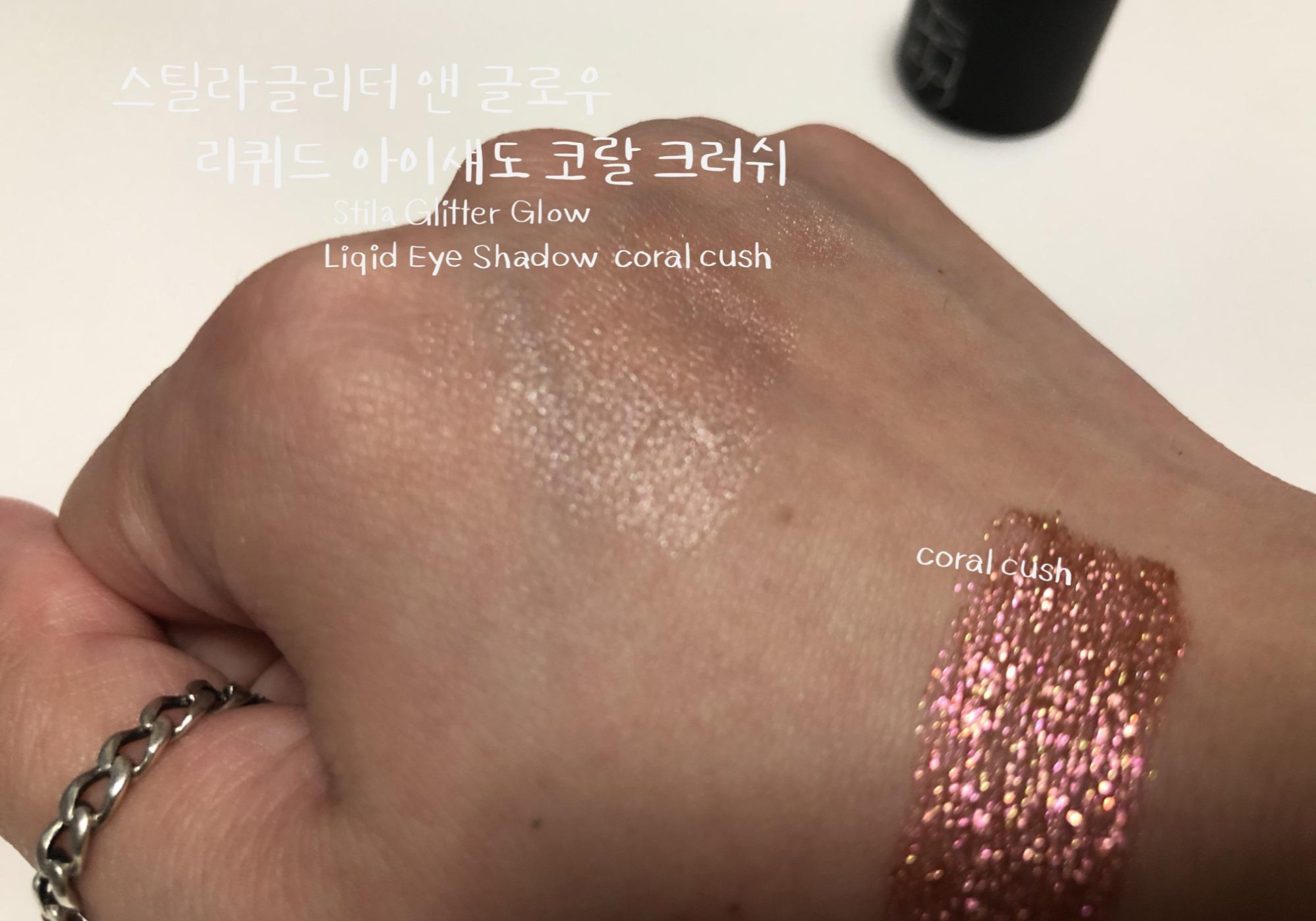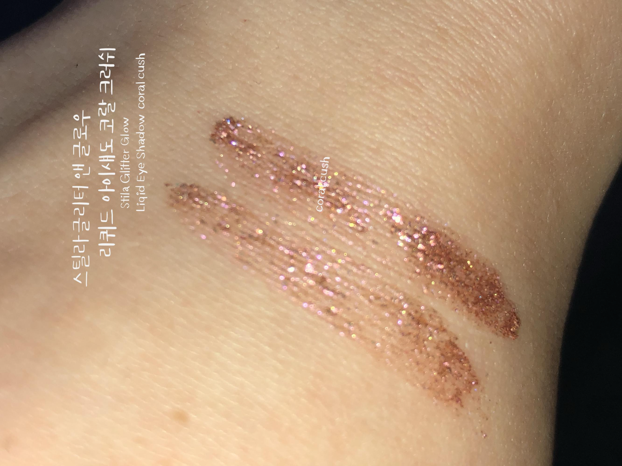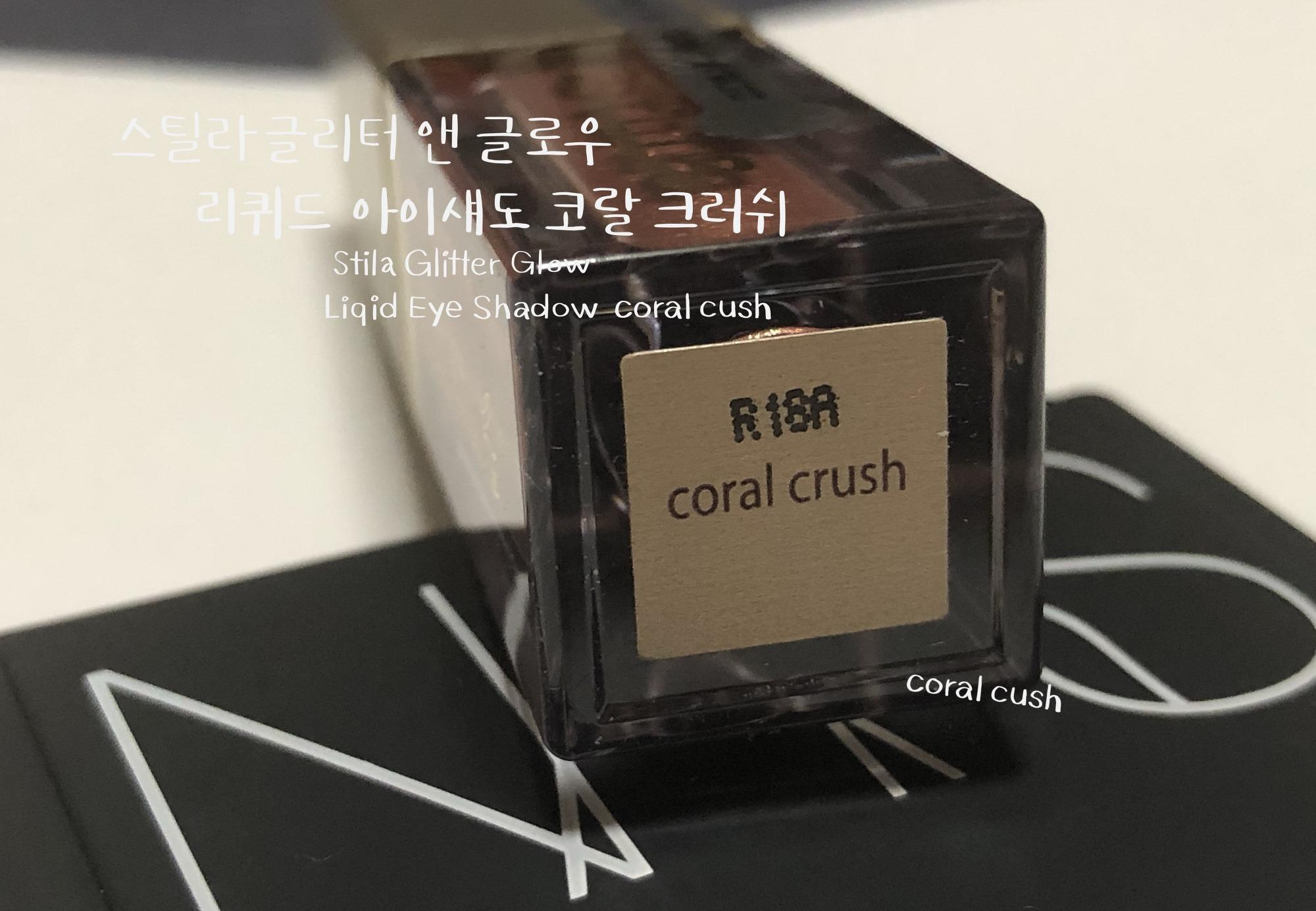스틸라 글리터 코랄크러쉬는 발랄한 코랄 베이스에 핑크 골드 펄이 화려한 웜톤 리퀴드 섀도우입니다. 수분 베이스에 존재감 확실한 펄들이 들어있어 밀착력이 우수합니다. 리퀴드 섀도우의 특징인 워터프루프라서 수분에 절대적으로 강한 섀도우입니다. 비 오는 날에 테스트해보고 싶어지네요.
