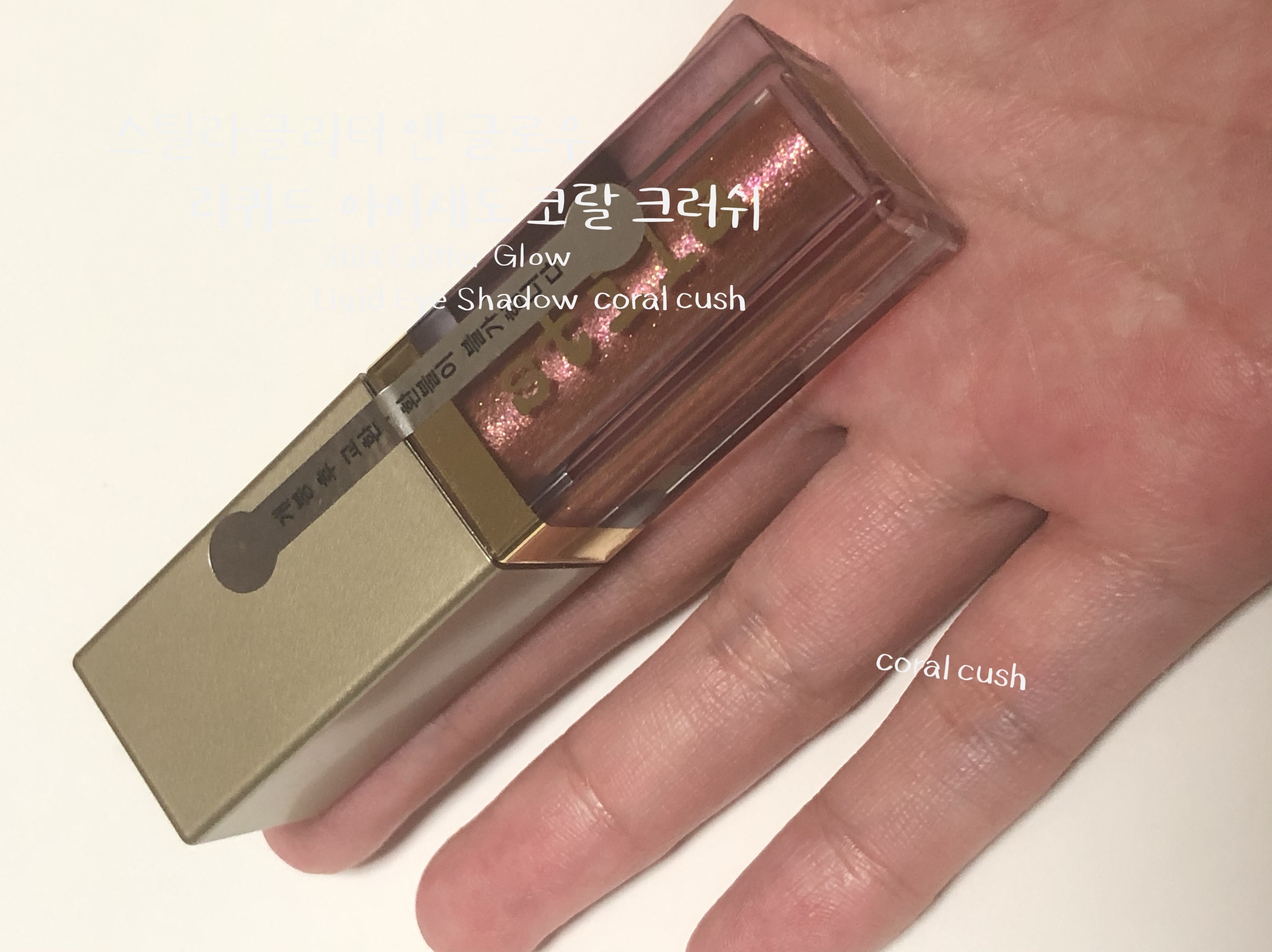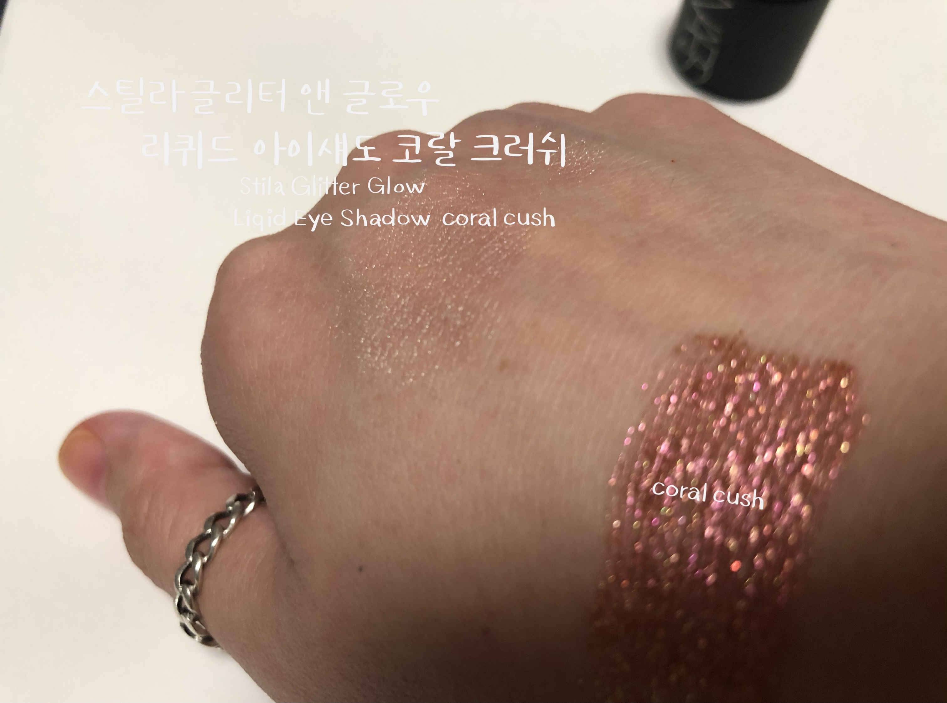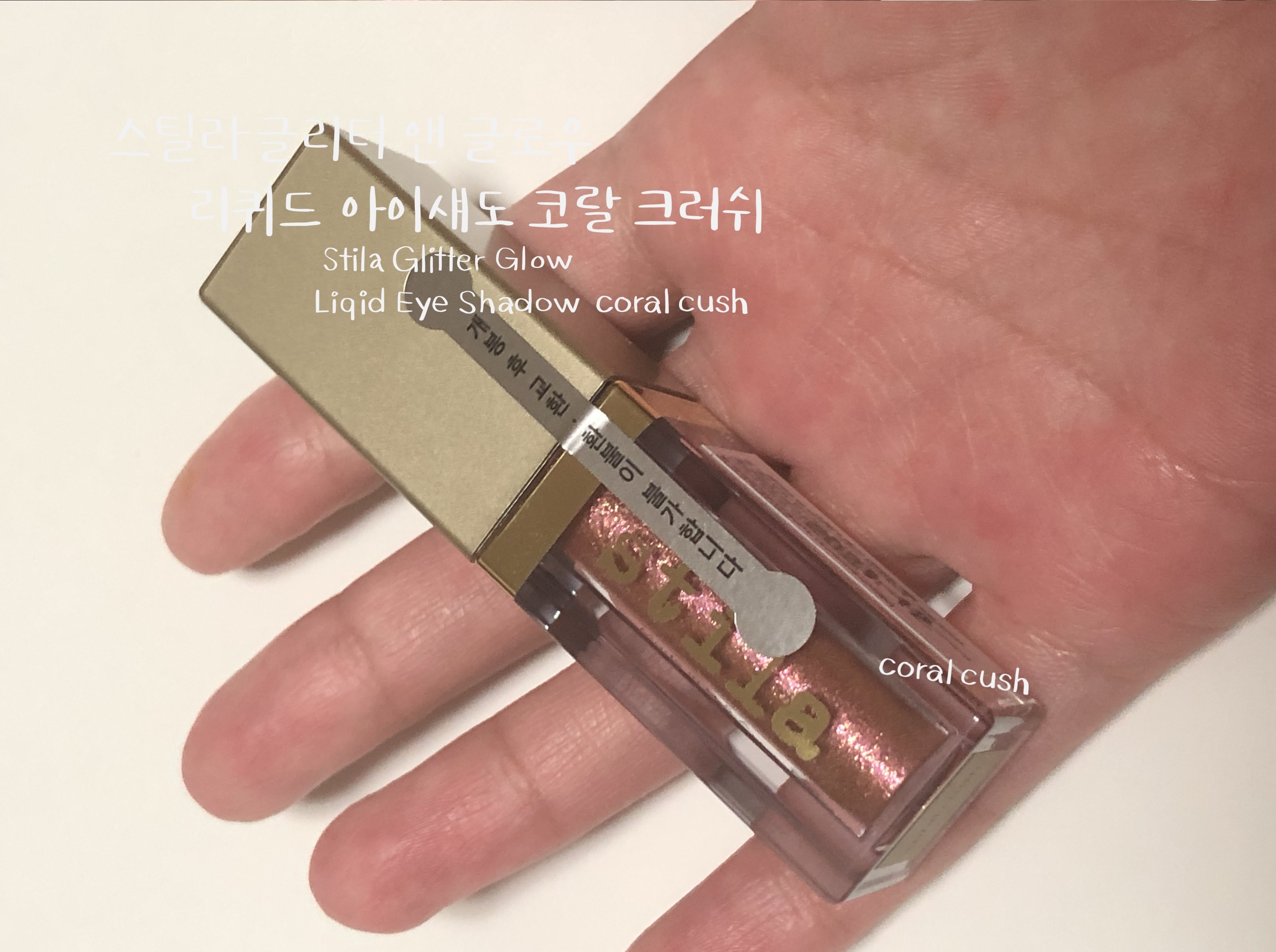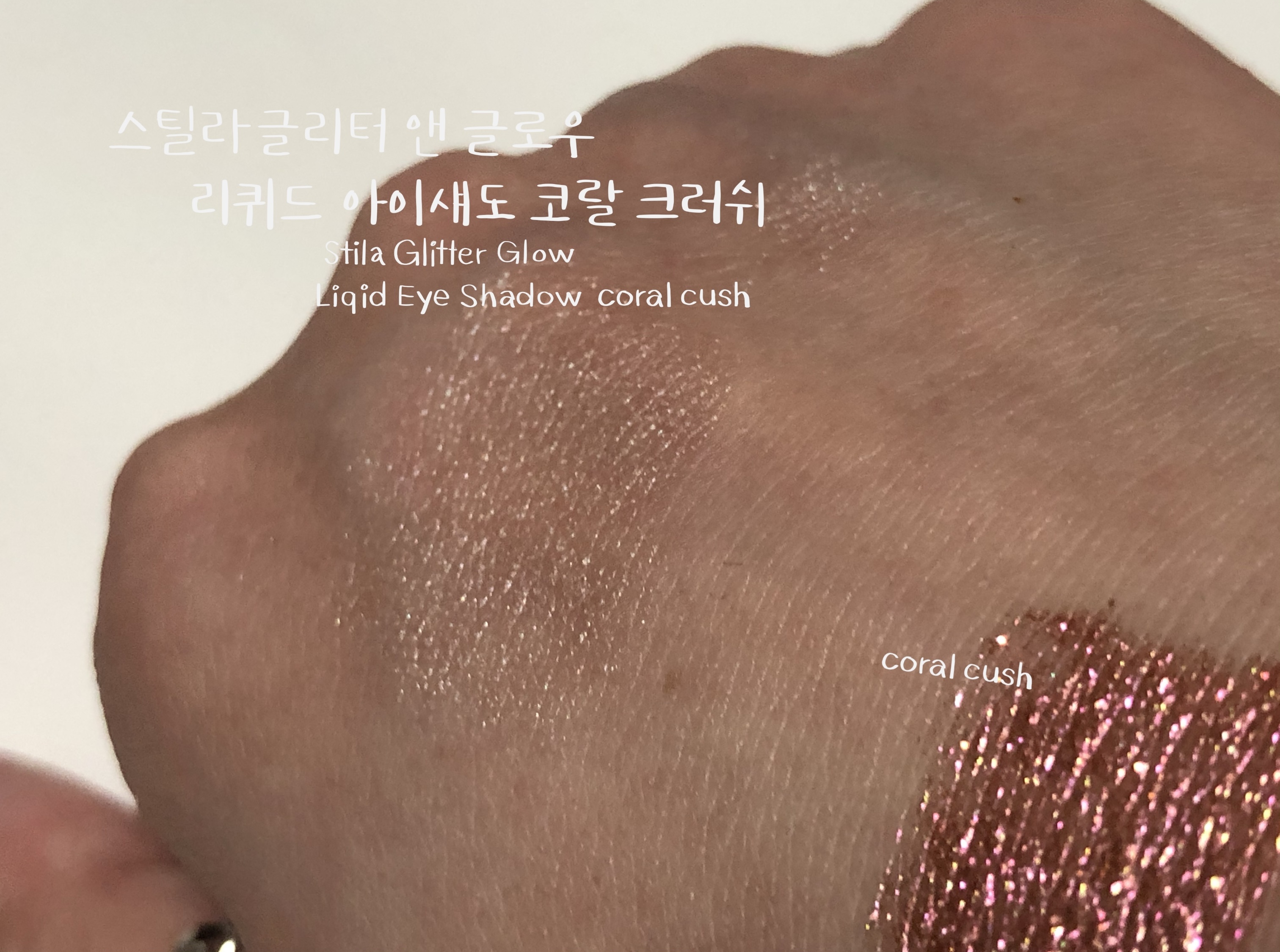 스틸라 글리터 코랄크러쉬는 발랄한 코랄 베이스에 핑크 골드 펄이 화려한 웜톤 리퀴드 섀도우입니다. 수분 베이스에 존재감 확실한 펄들이 들어있어 밀착력이 우수합니다. 리퀴드 섀도우의 특징인 워터프루프라서 수분에 절대적으로 강한 섀도우입니다. 비 오는 날에 테스트해보고 싶어지네요.