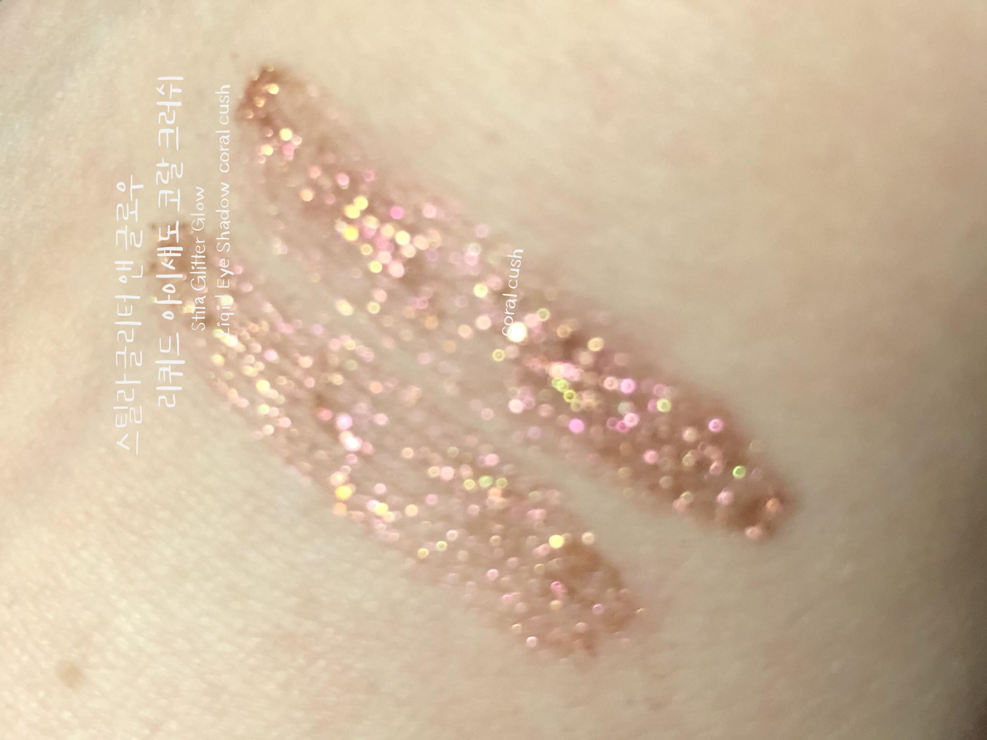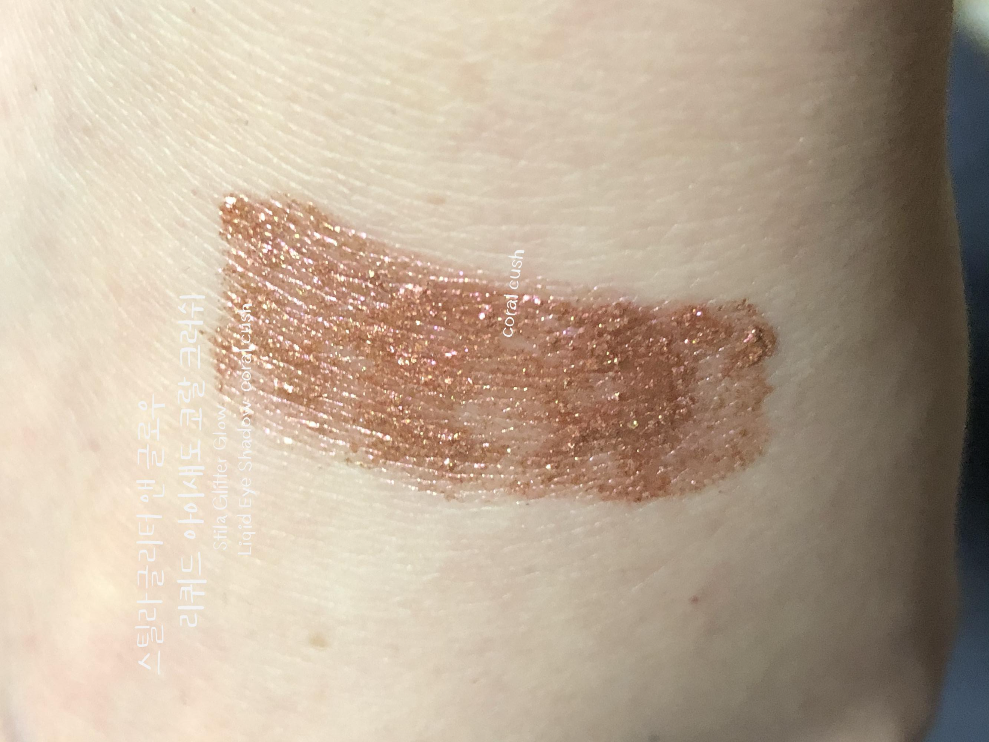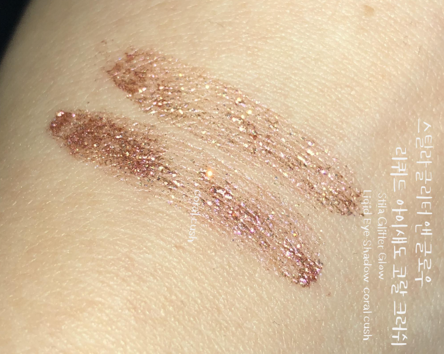 스틸라 글리터 코랄크러쉬는 발랄한 코랄 베이스에 핑크 골드 펄이 화려한 웜톤 리퀴드 섀도우입니다. 수분 베이스에 존재감 확실한 펄들이 들어있어 밀착력이 우수합니다. 리퀴드 섀도우의 특징인 워터프루프라서 수분에 절대적으로 강한 섀도우입니다. 비 오는 날에 테스트해보고 싶어지네요.