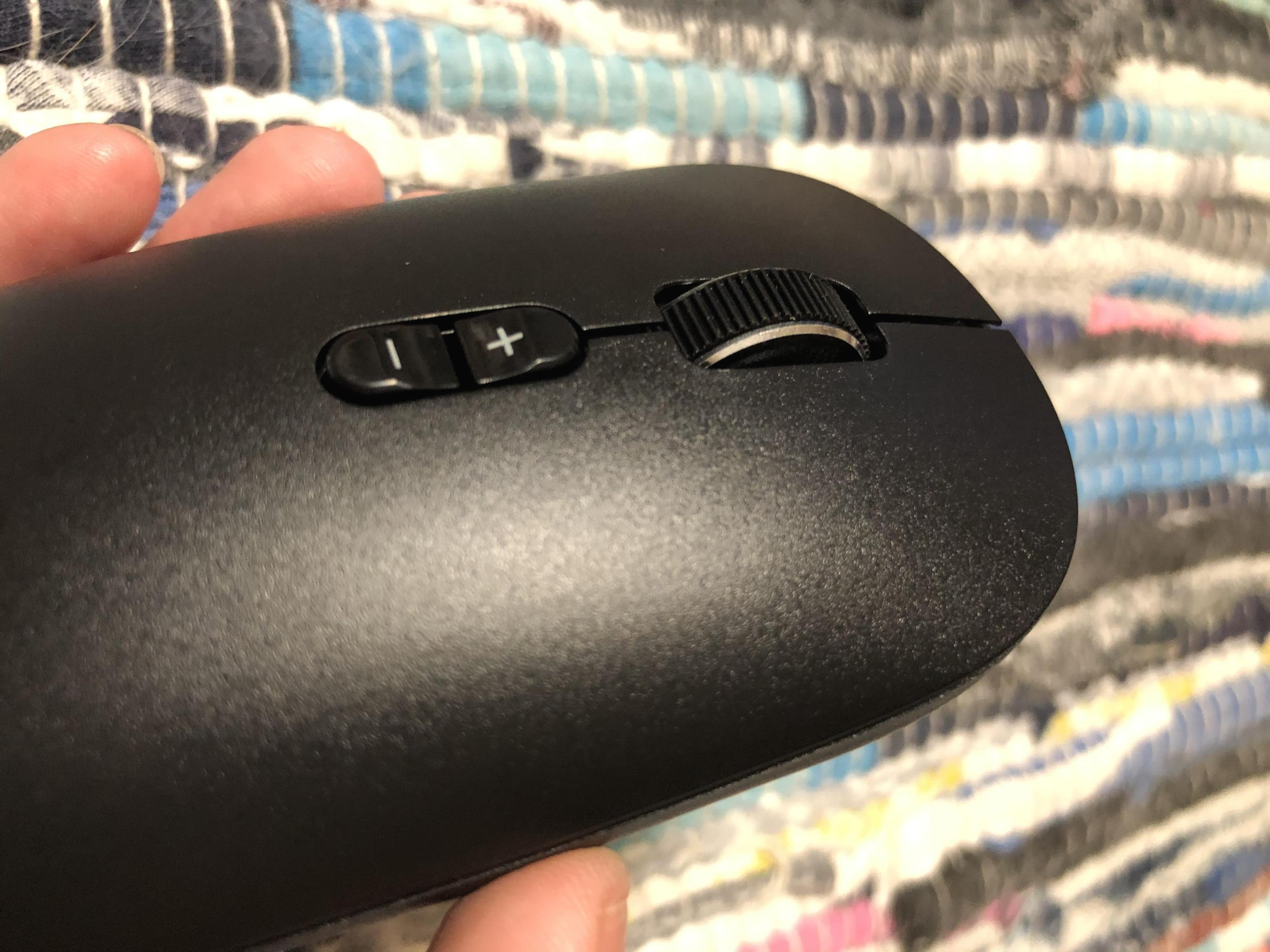 >> 마우스 중앙 조금 위에 휠이 위치하고, 휠 바로 밑에 감도조절버튼이 있습니다.