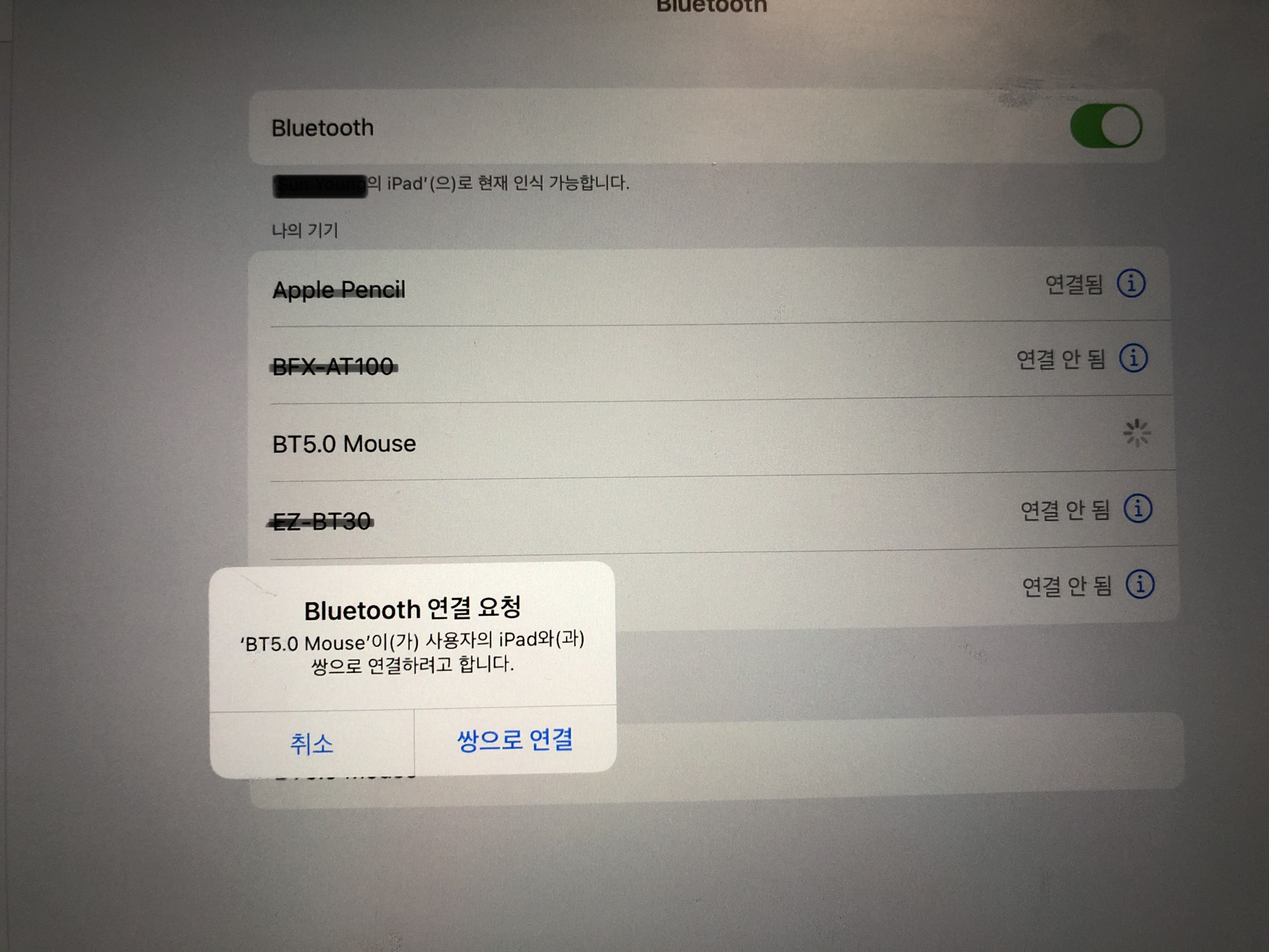1. '""BT3.0 Mouse'이(가) 사용자의 ipad와 쌍으로 연결하려고 합니다."라는 메세지가 뜹니다.
