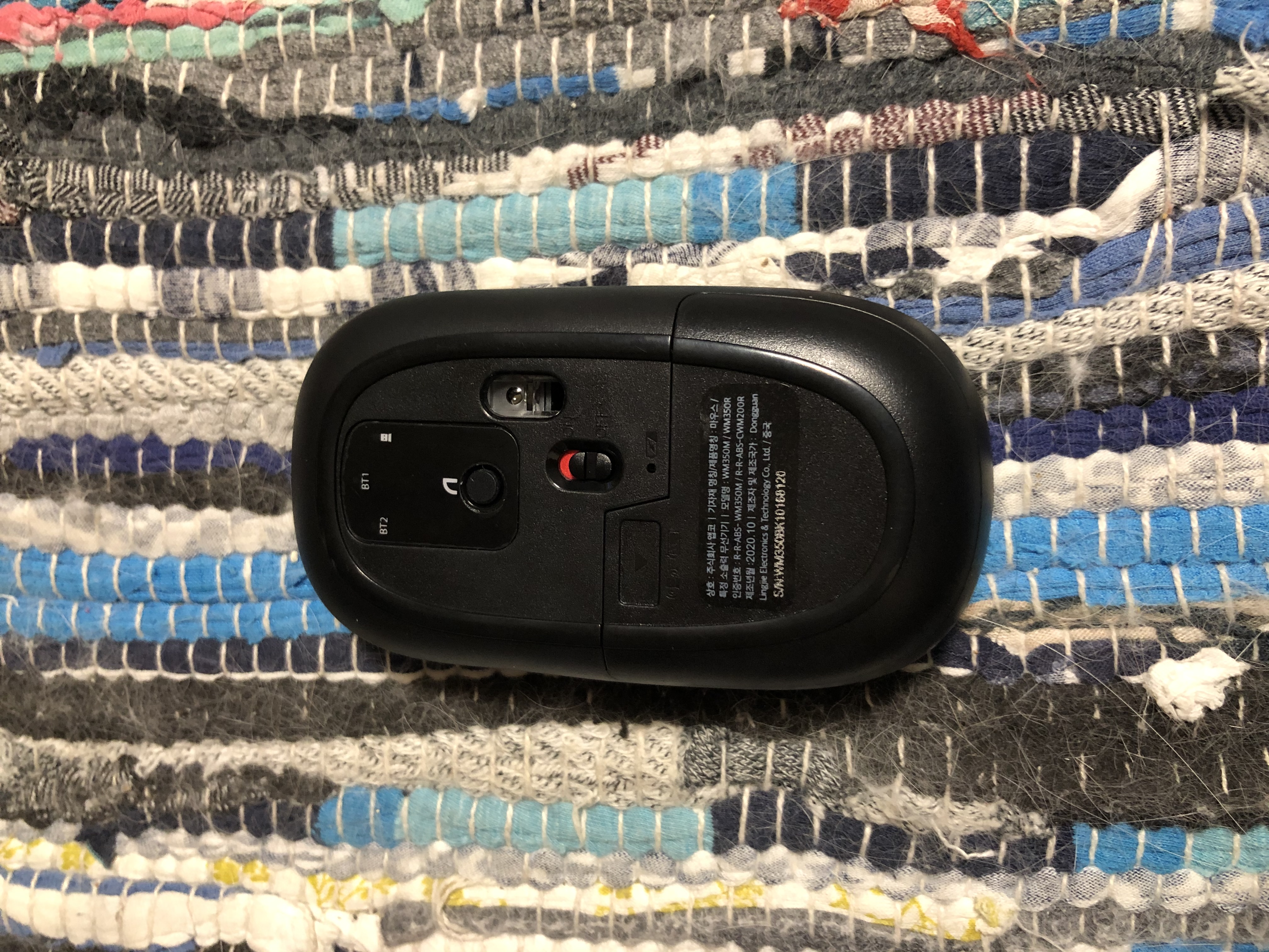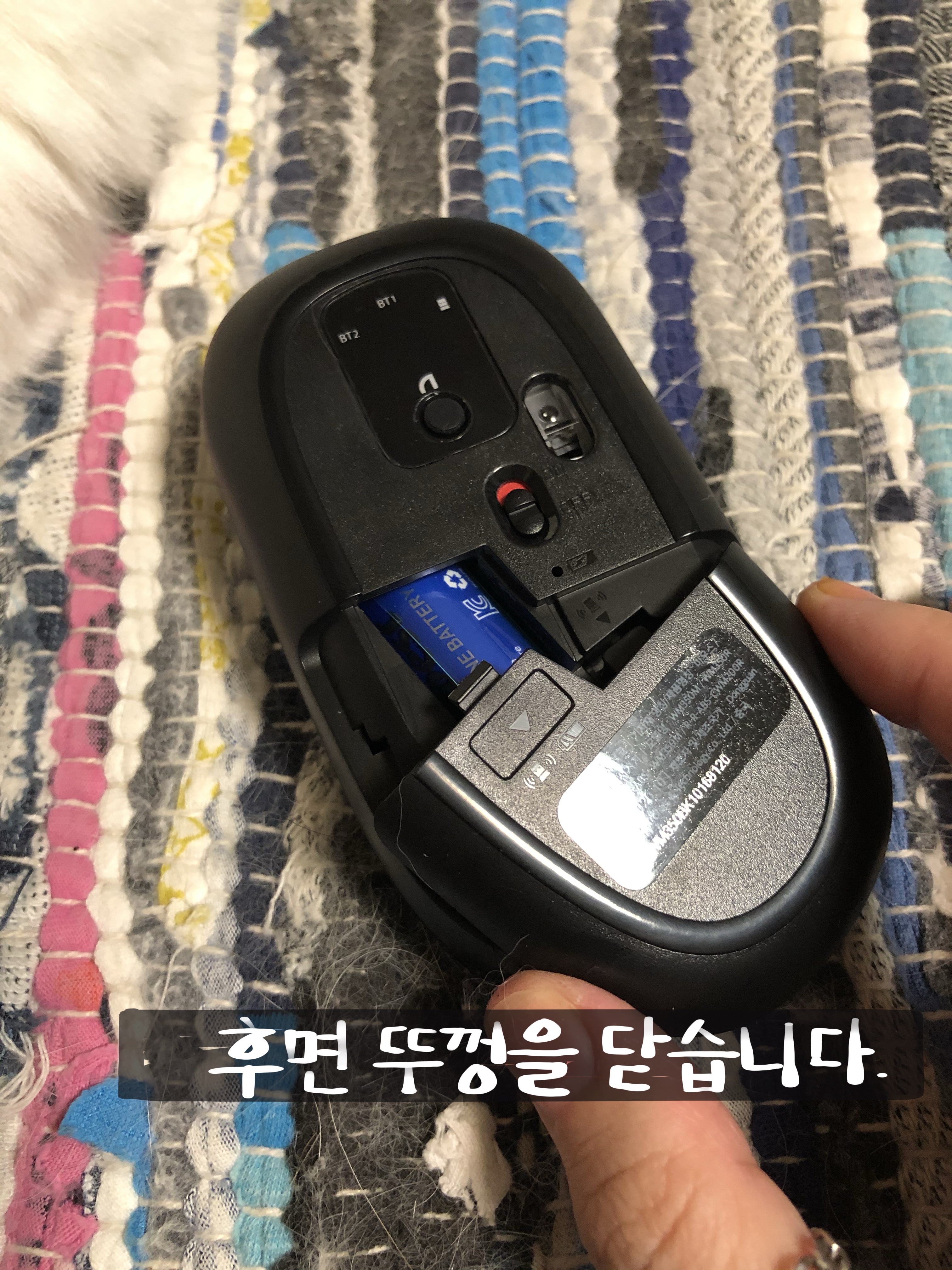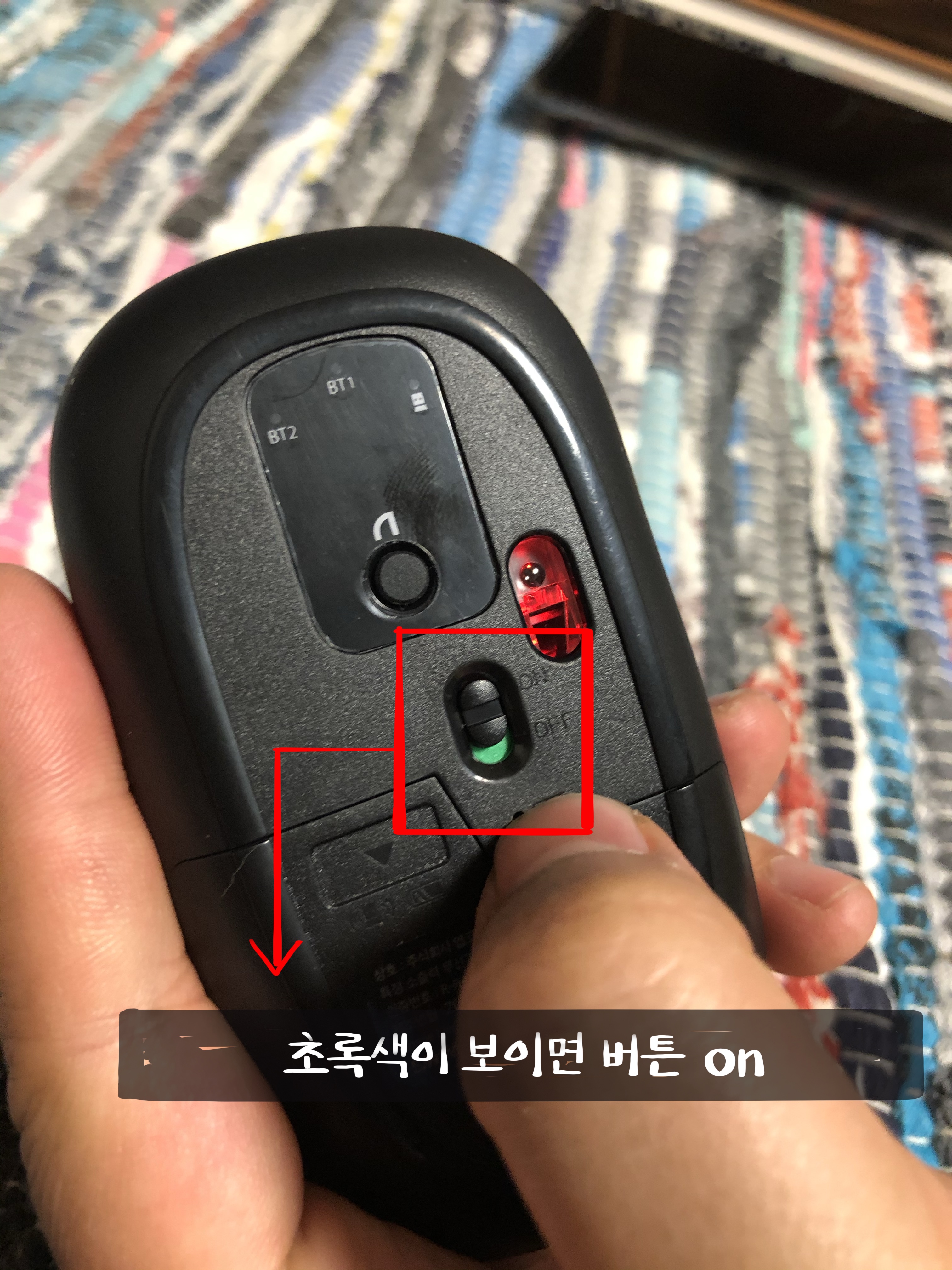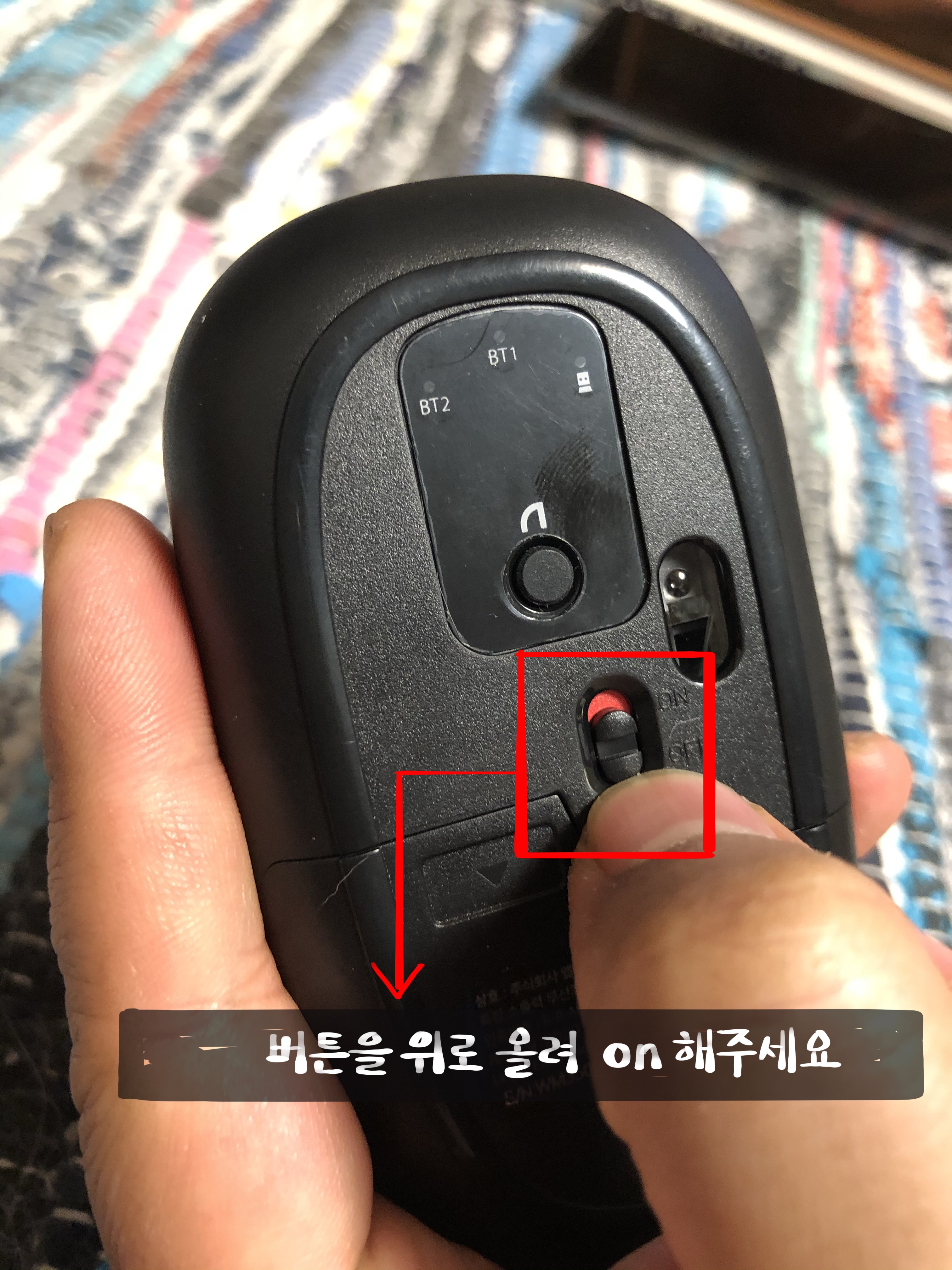 5. 마우스 뒷면에 on/off에서 버튼을 위로 올려 스위치 on 으로 켭니다.